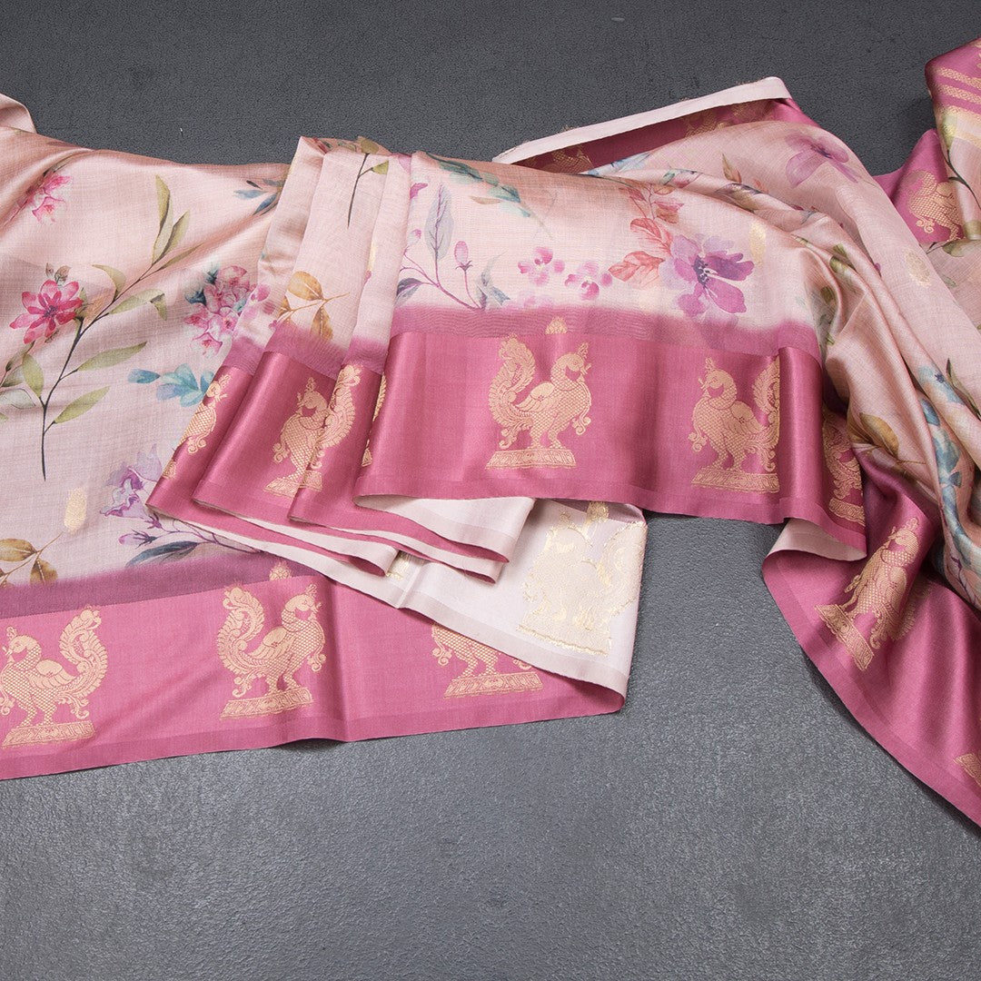 Raw Silk Light Pink Floral Printed Saree With Zari Border