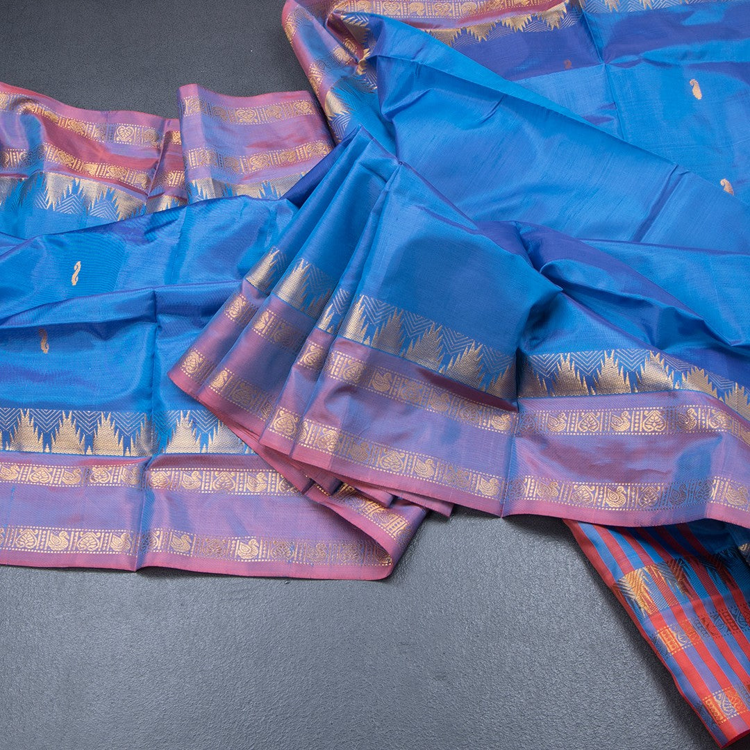 Vaazhai Naar Peacock Blue Saree With Thread Buttas And Contrast Pallu