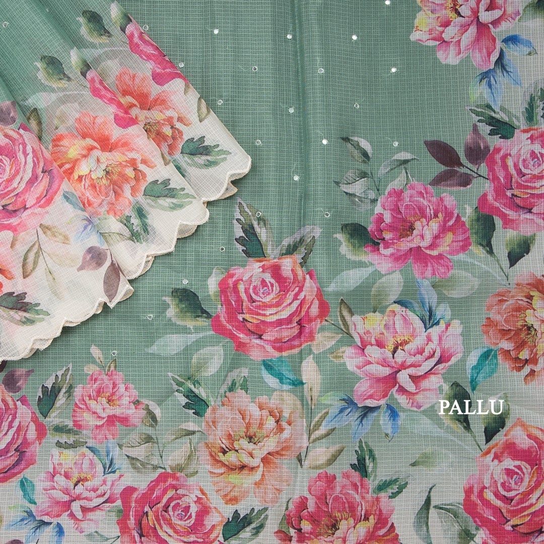 Kota Tissue Green Printed Saree,Handpicked stylish sarees in amazing fabrics with pleasing designs to bring the oomph factor in you.