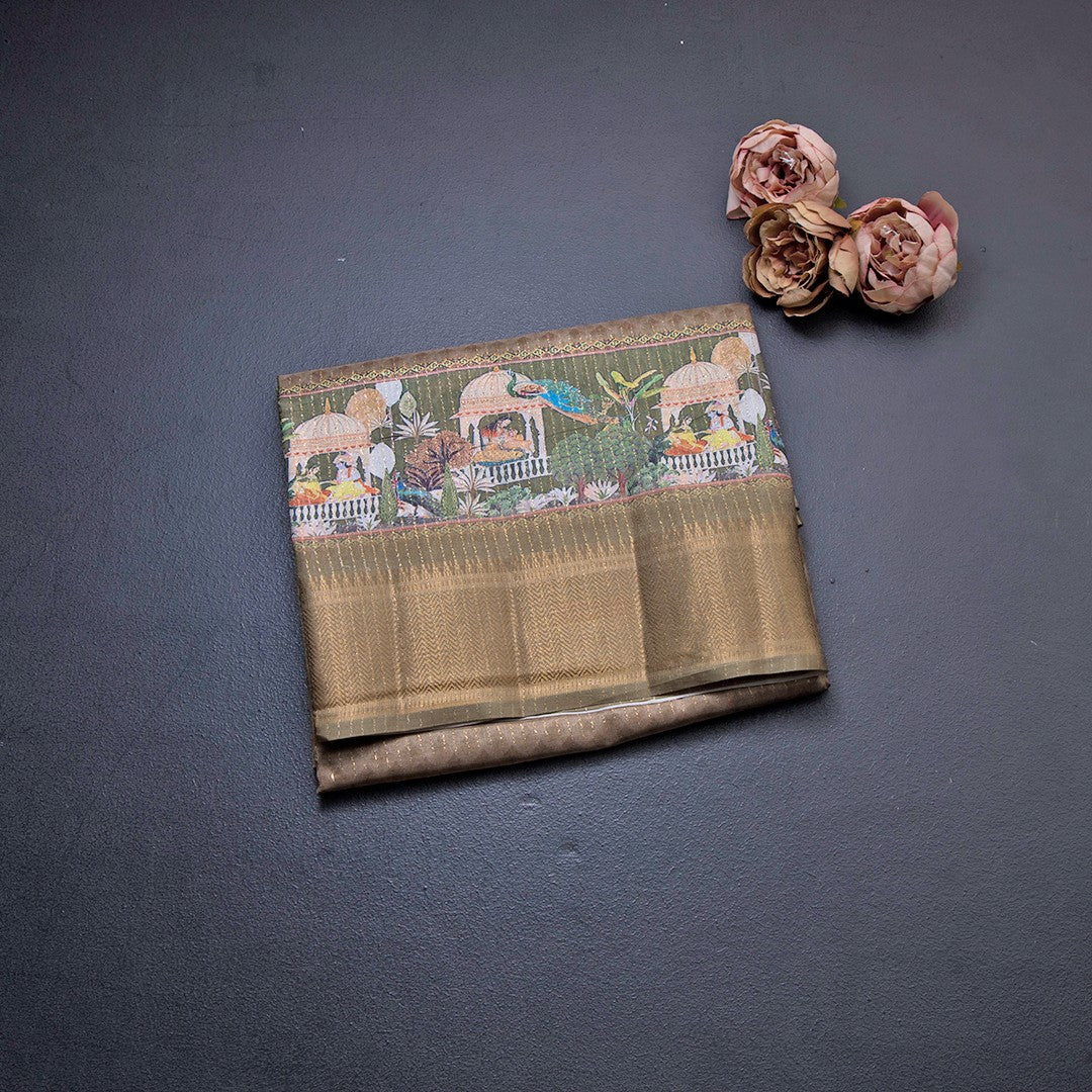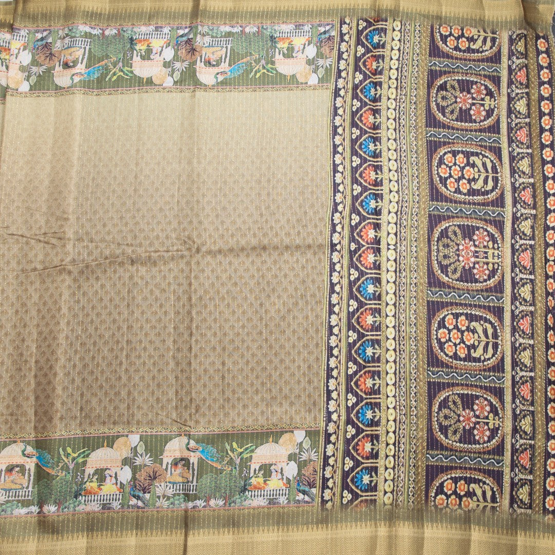 Semi Raw Silk Mehandi Green Printed With Zari Stripes Saree