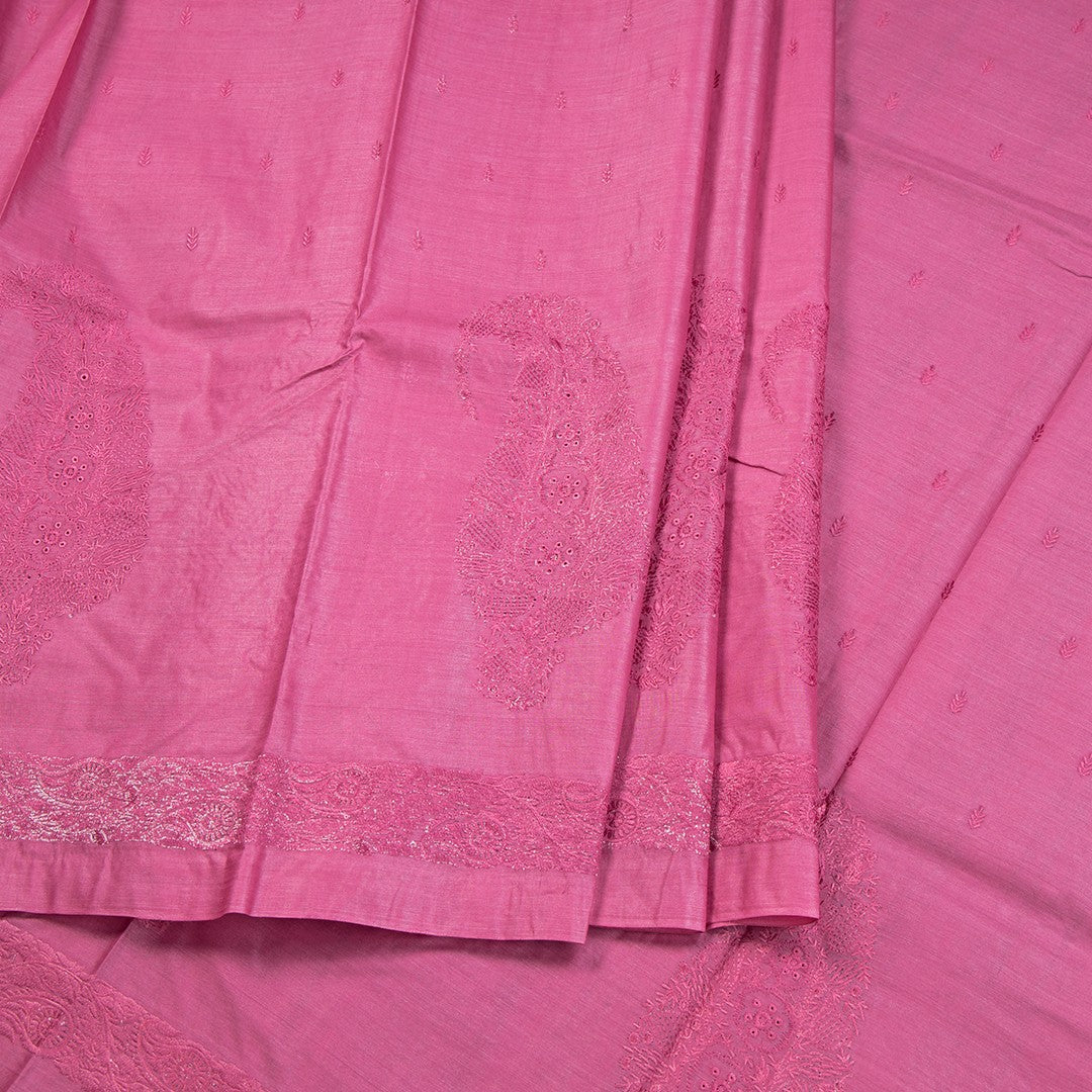 Semi Tussar Dak Pink Thread work Saree, Semi tussar sarees are known for their natural texture, resembling pure tussar silk, but they are generally lighter and easier to drape. This makes them versatile for both casual and festive wear. These sarees are appreciated for their elegant appearance, fine texture, and affordability. Many are adorned with intricate handwoven patterns, adding to their charm and appeal.