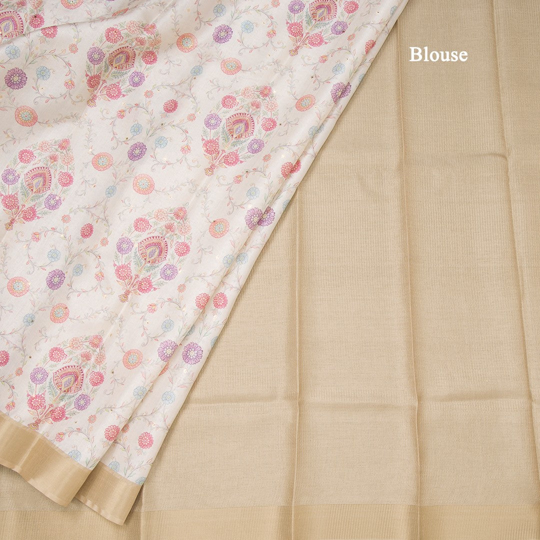 Raw Silk Cream Floral Printed Saree With Zari Border 06