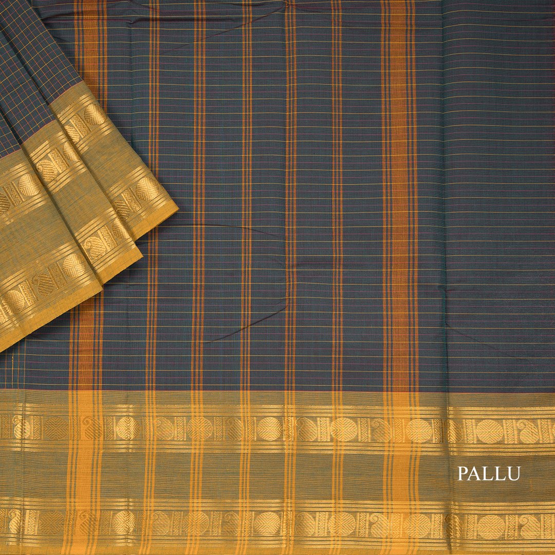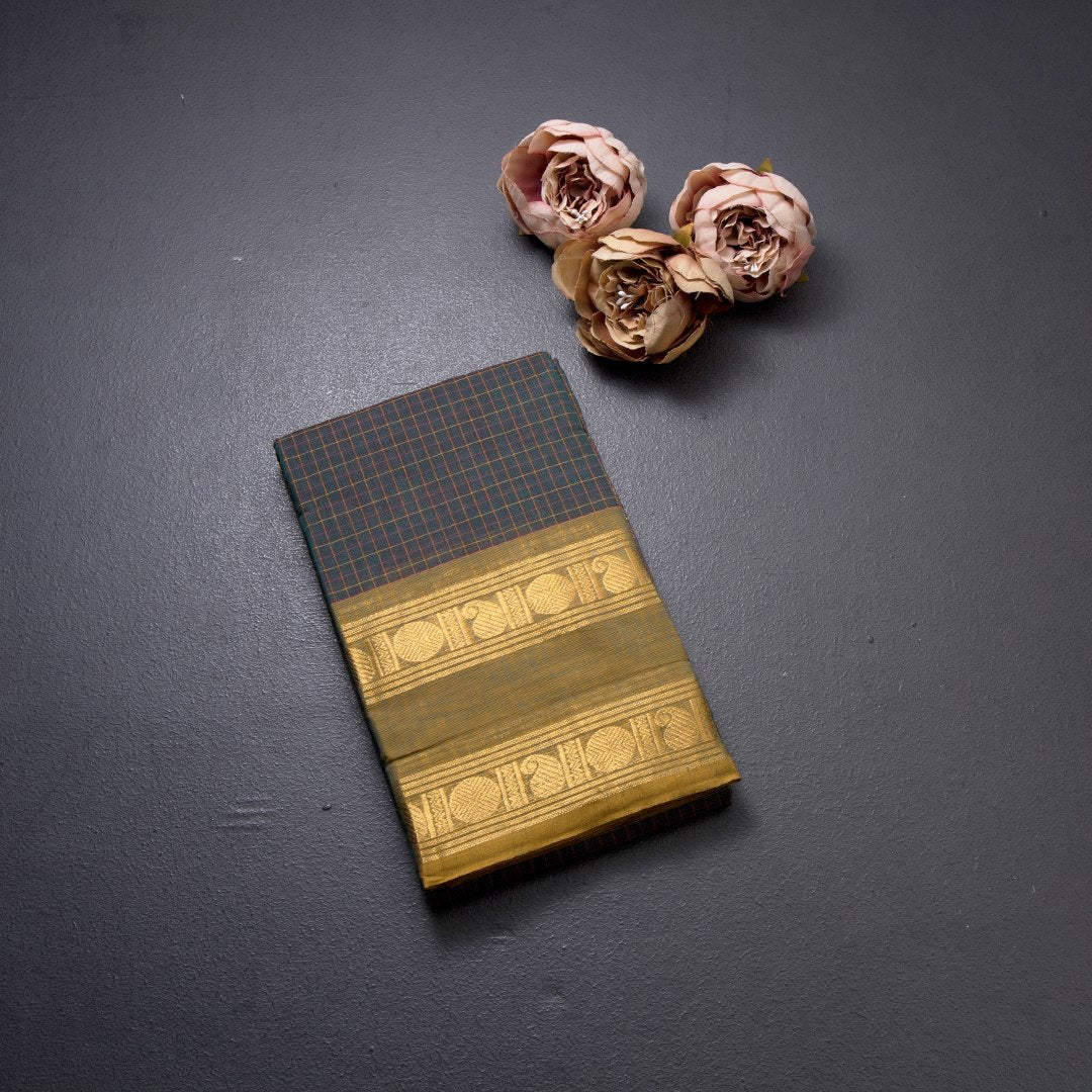Chettinad Cotton Dark Green Checked Saree With Retta Petta Ganga Jamuna Border Without Blouse