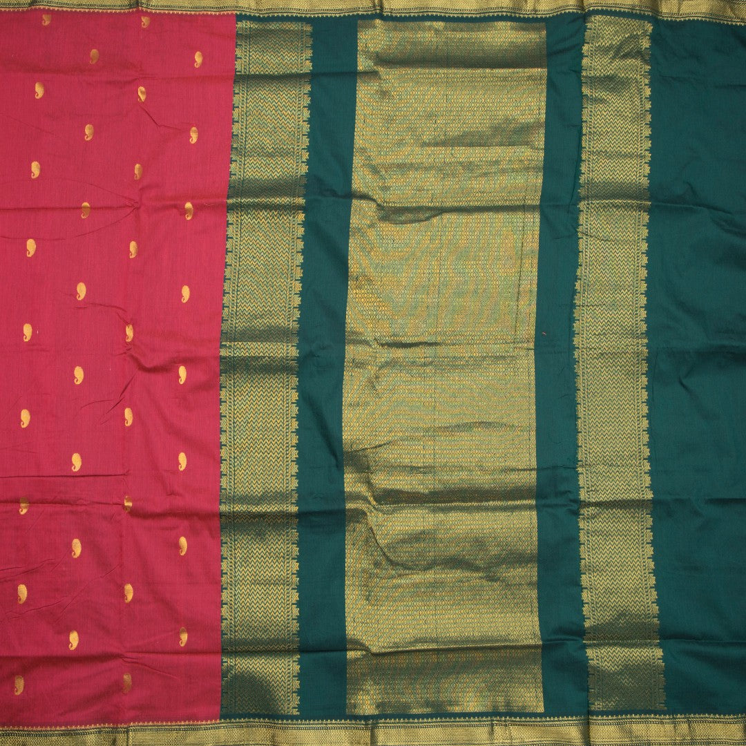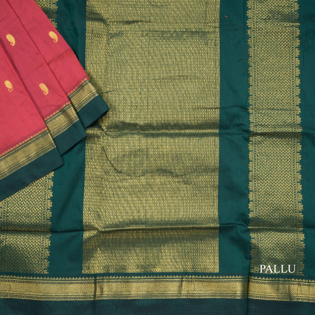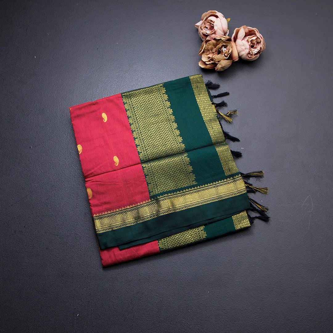 Kalyani Cotton Reddish Pink Saree With Zari Buttas And Contrast Border