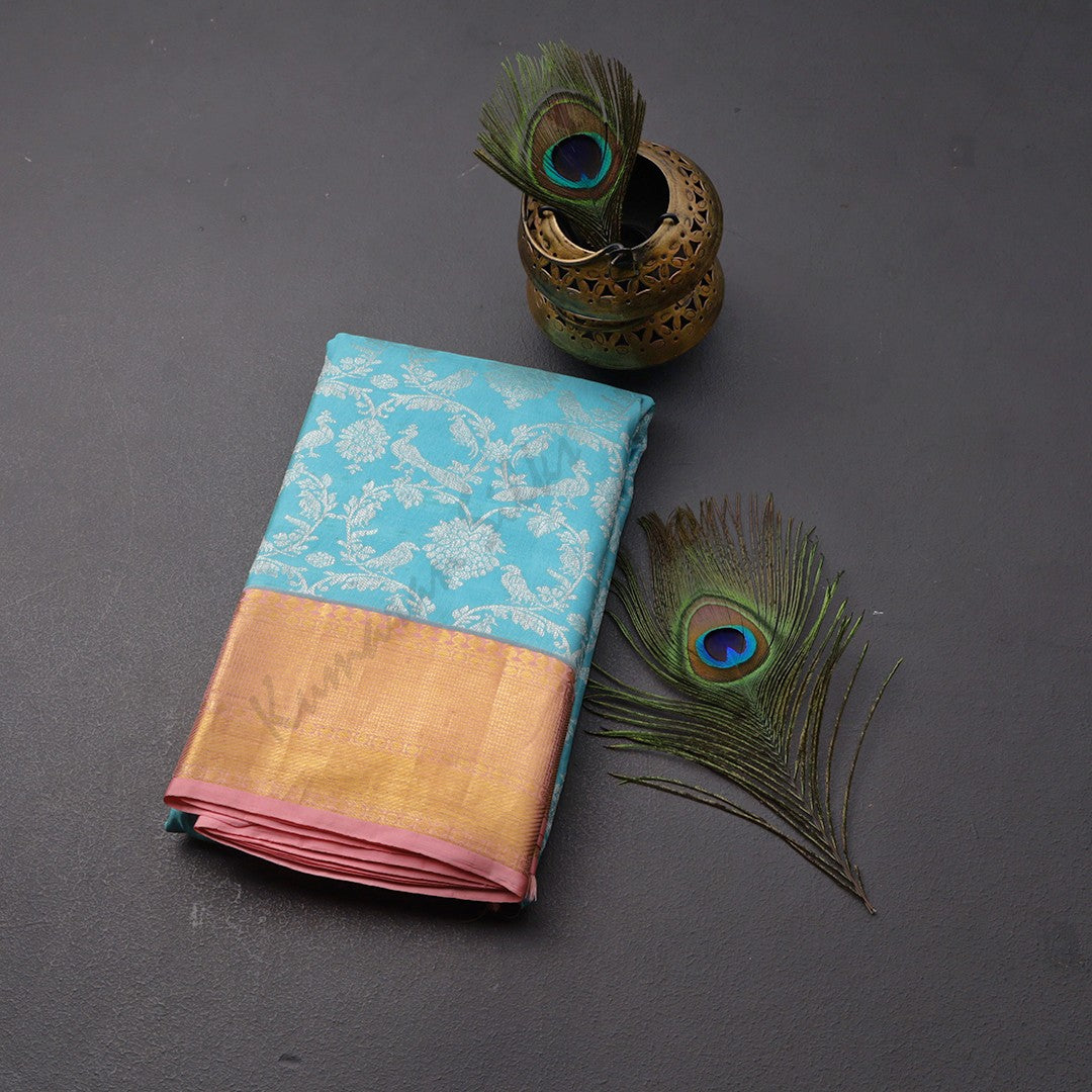 Blue Floral Brocade Silk Saree With Pink Zari Border