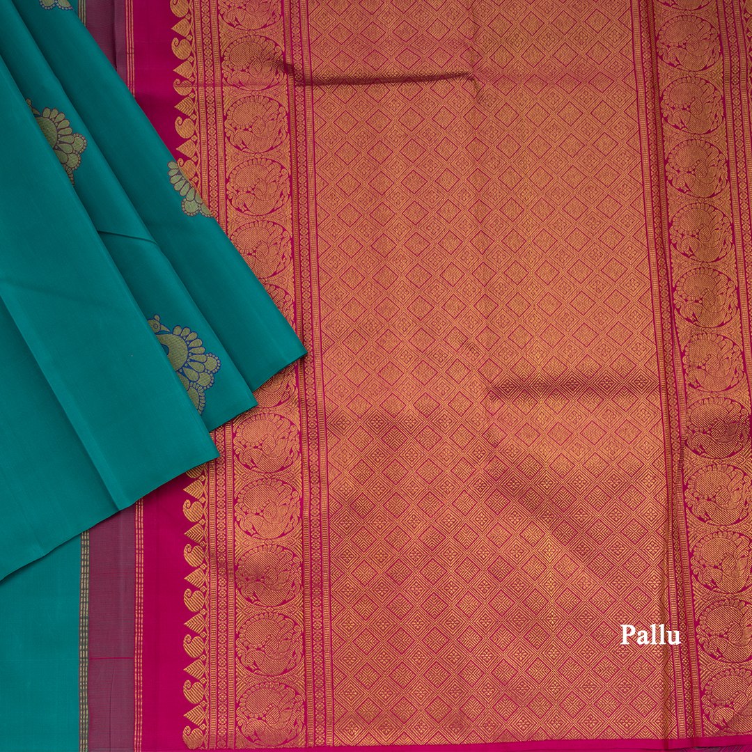 Borderless Turquoise Blue With Peacock Butta On Body With Contrast Pallu, Crafted from the finest quality silk, the saree features intricate traditional motifs—such as peacocks, temple borders, floral vines, and mythical figures—each symbolizing cultural richness and spiritual significance. The design is further enhanced by beautifully woven zari patterns, adding a regal sheen to the fabric.