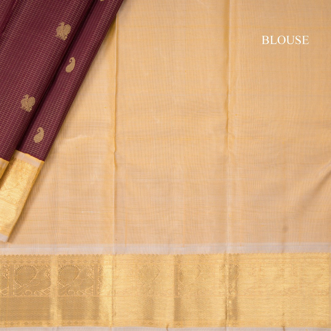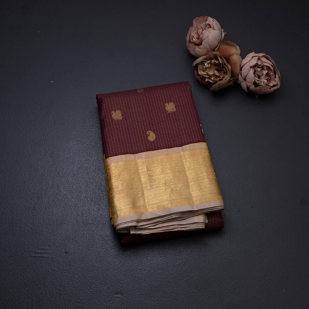 Dark Brown Micro Checked Silk Saree On Peacock And Mango Buttas And Gold Zari Border, Handloom silk sarees woven from the looms of Kanchipuram with traditional motifs and beautiful zari patterns
