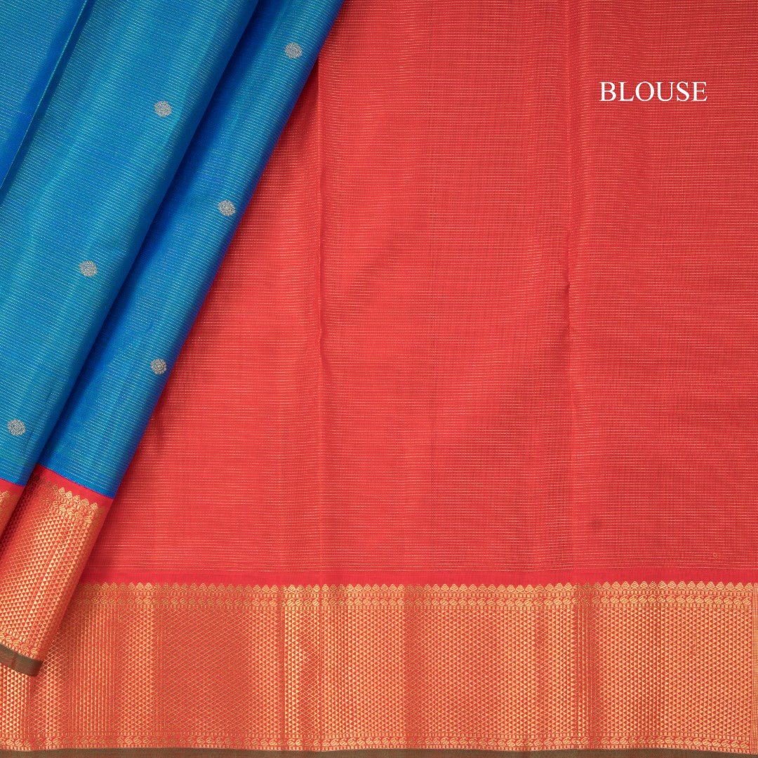 Peacock Blue Silk Saree With Zari stripes With Small Buttas And Red Zari Border, Handloom silk sarees woven from the looms of Kanchipuram with traditional motifs and beautiful zari patterns