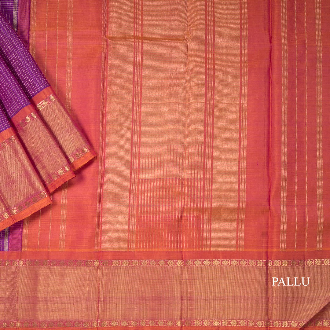 Purple Micro Checked Silk Saree And Rettapet Border, Handloom silk sarees woven from the looms of Kanchipuram with traditional motifs and beautiful zari patterns
