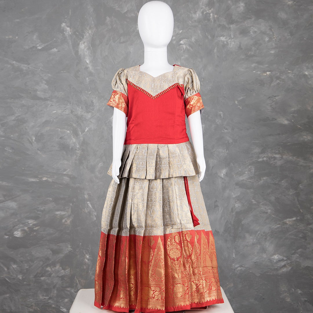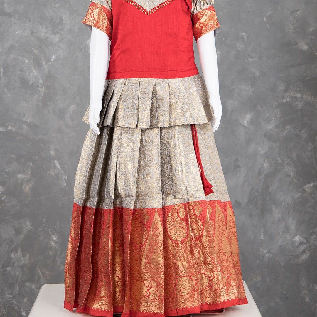 Red And Grey Embossed Kids Pavadai, Colourful pavadas for fun little girls. Light up their day by dressing them up in these peppy and pretty pavadas.