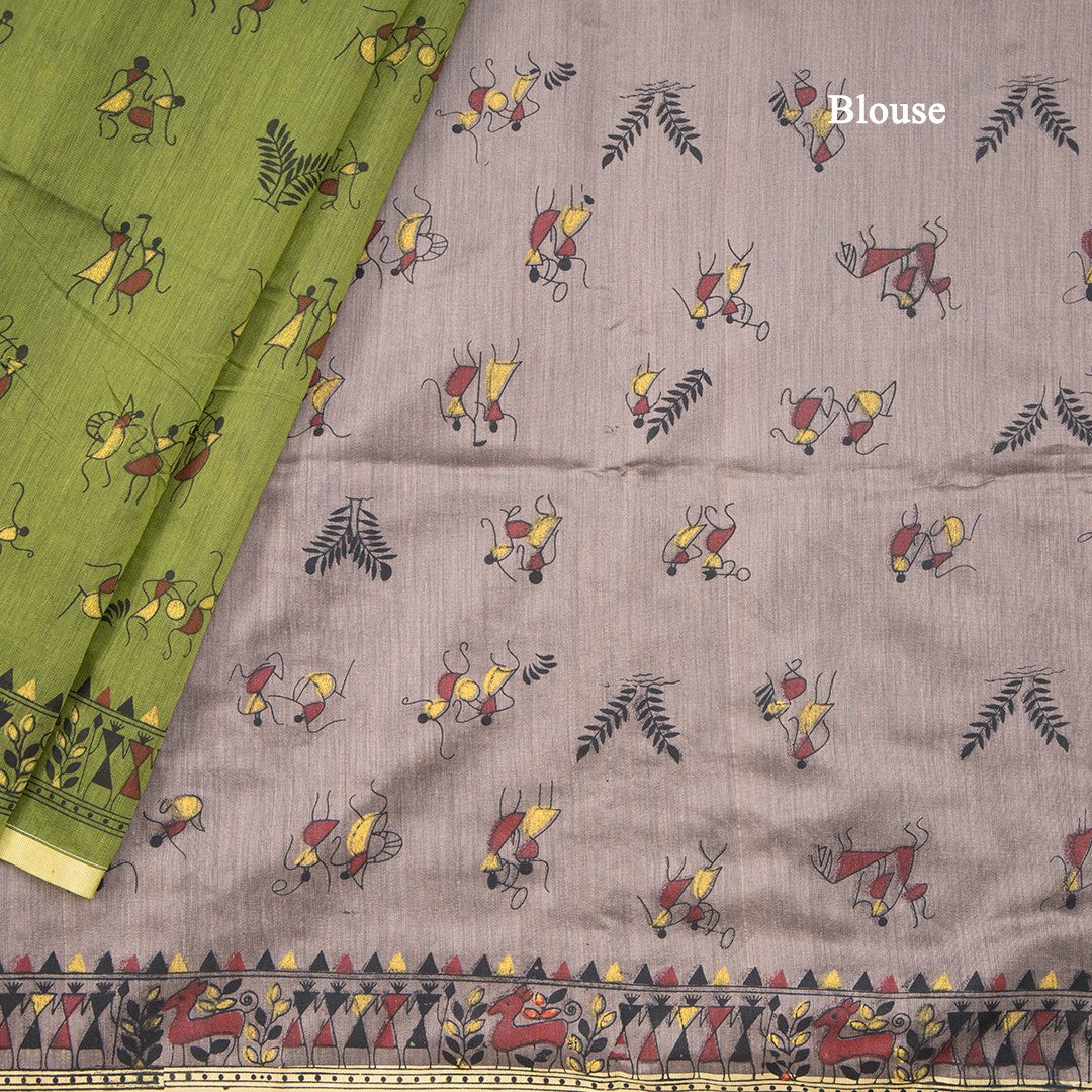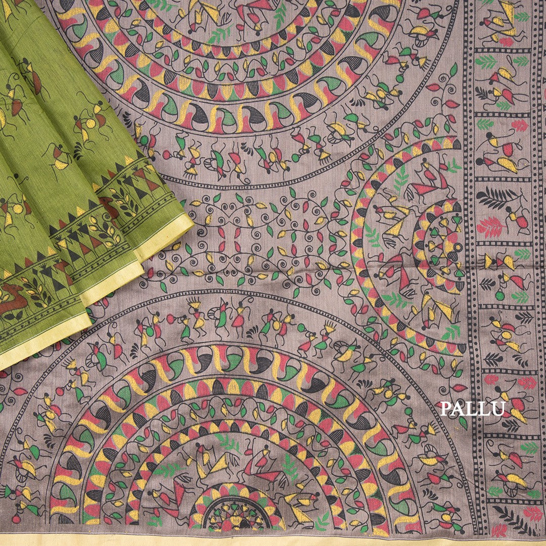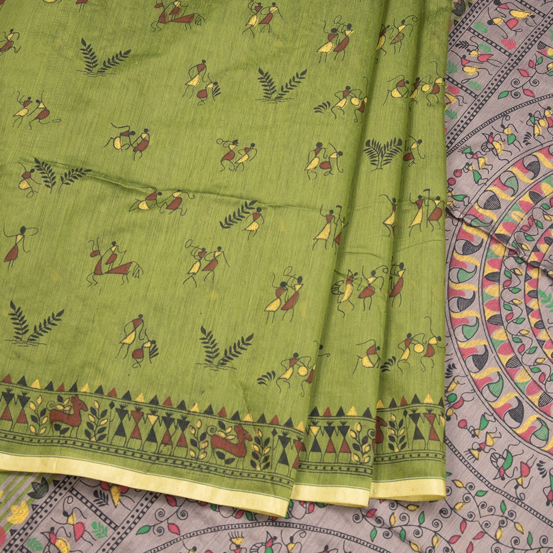 Semi Linen Olive Green Printed Saree 02, For an exceptional look on any occasion, opt for a semi linen sari and stand out from the crowd