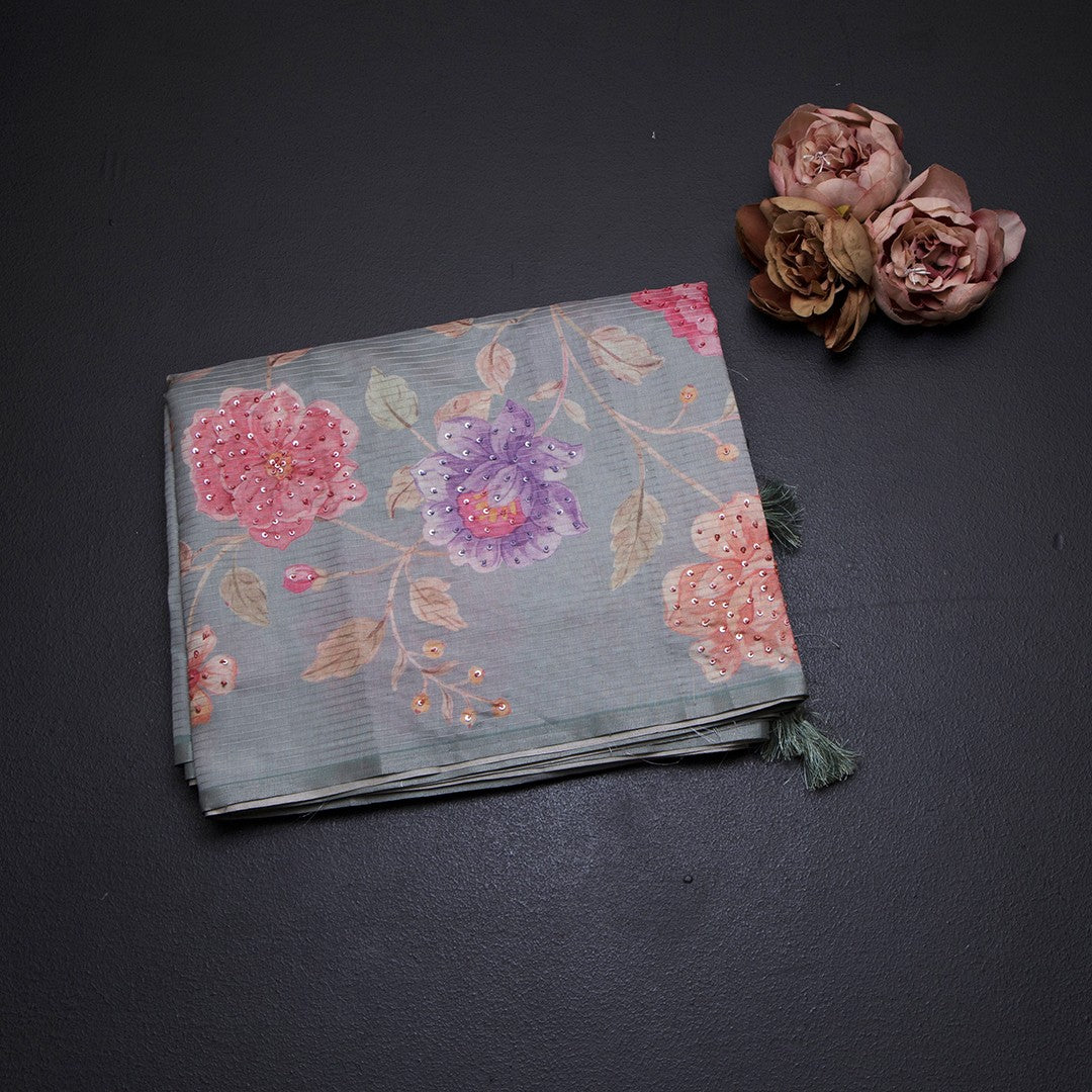 Raw Silk Pista Green Zari stripes Saree And Printed Sequence Work