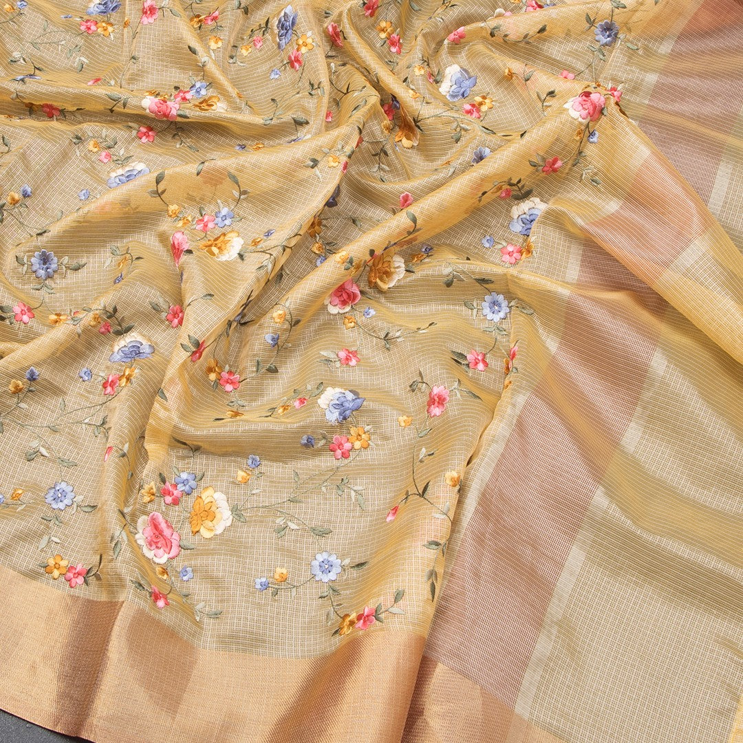 Tissue Kota Yellow Thread Embroidered Saree With Zari Border