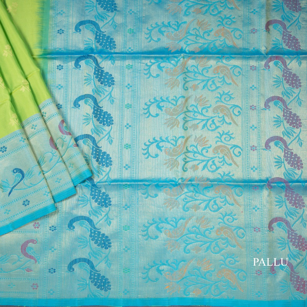 Parrot Green Soft Silk Saree With Tiny Buttis On Body And Paithani Border, Handloom Soft Silk Sarees from the weavers of South India designed with the love for colours and passion for traditional zari motifs complimented with chic borders.