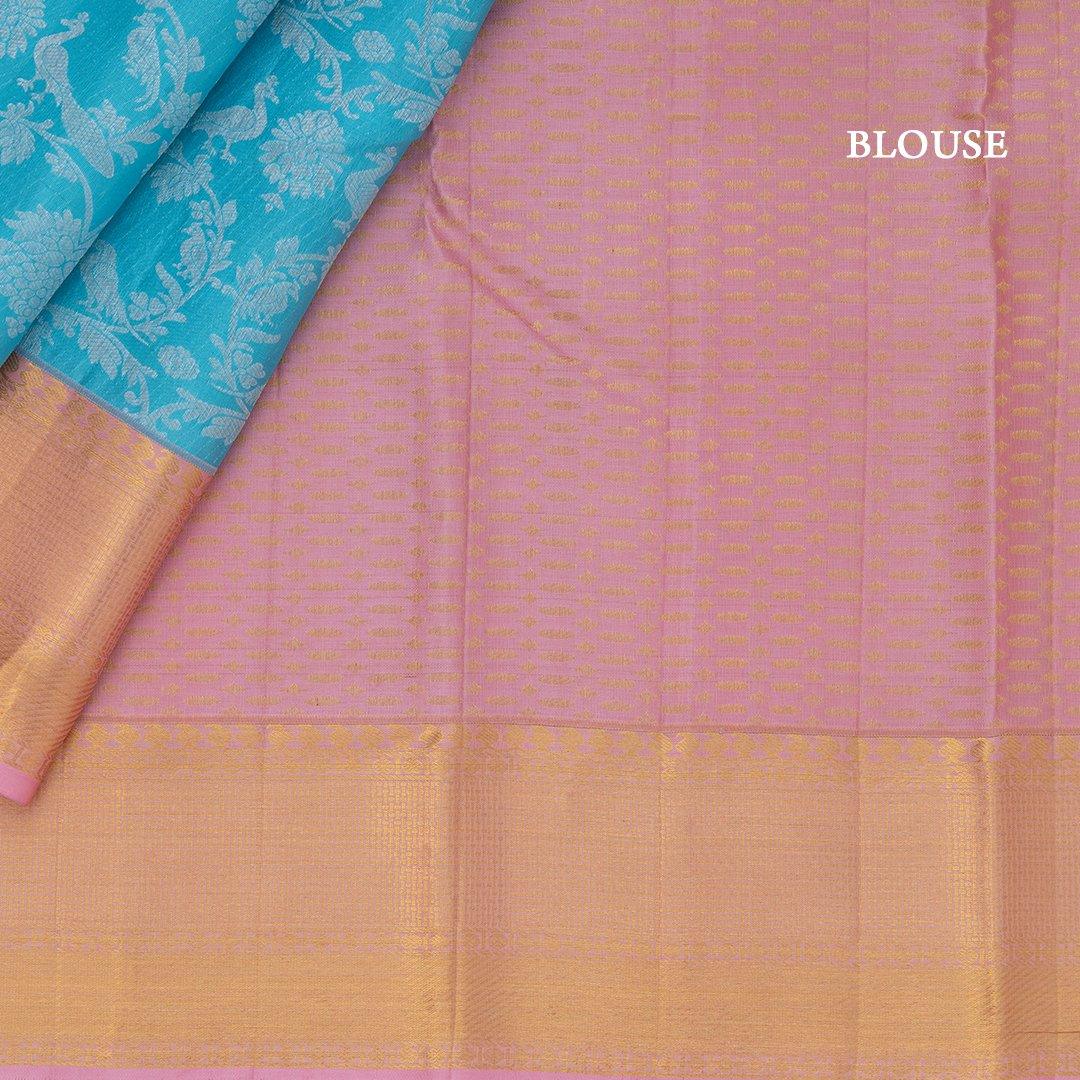 Blue Floral Brocade Silk Saree With Pink Zari Border
