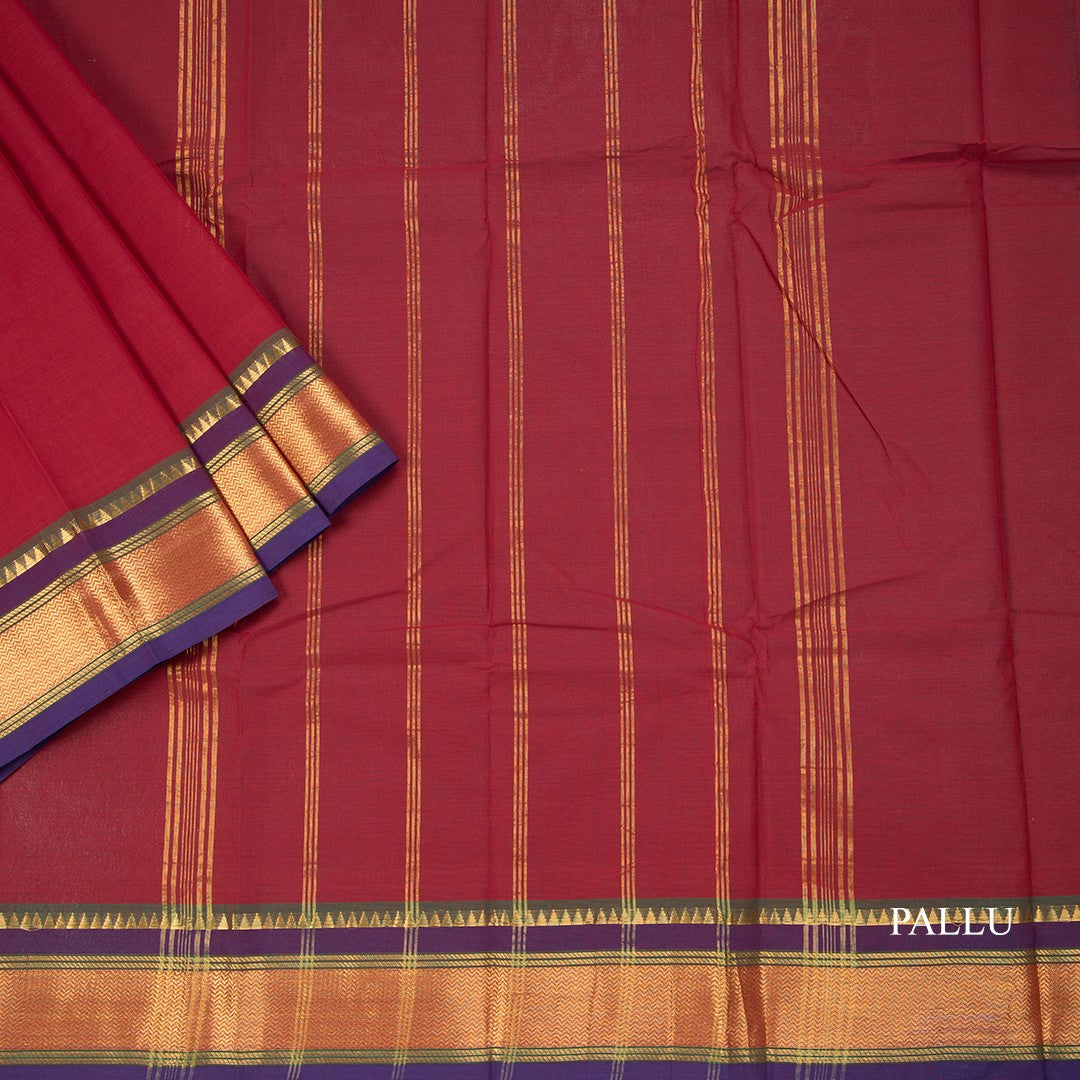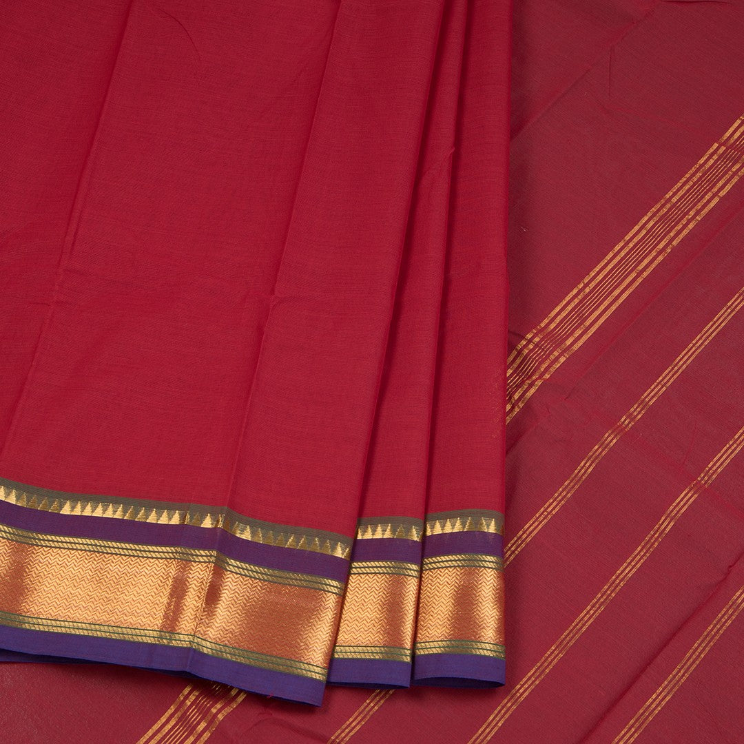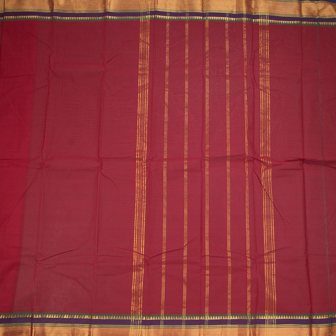 Chettinad Cotton Maroon Plain Saree With Temple Border Without Blouse