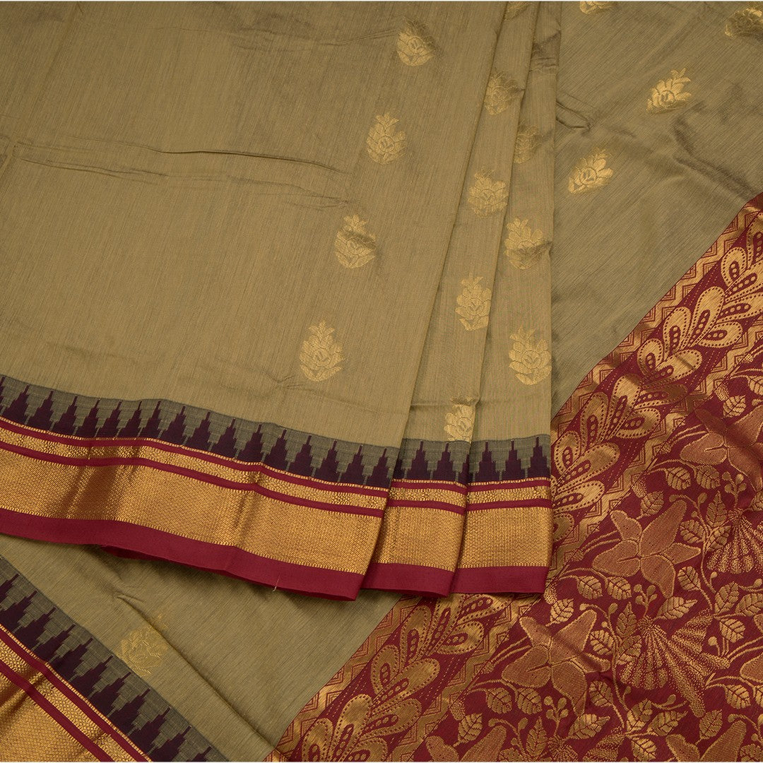 Kalyani Cotton Olive Green Saree With Zari Buttas And Temple Border 02