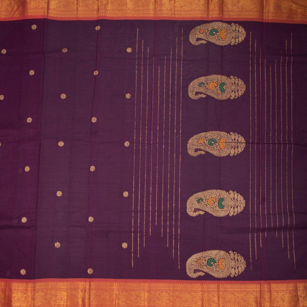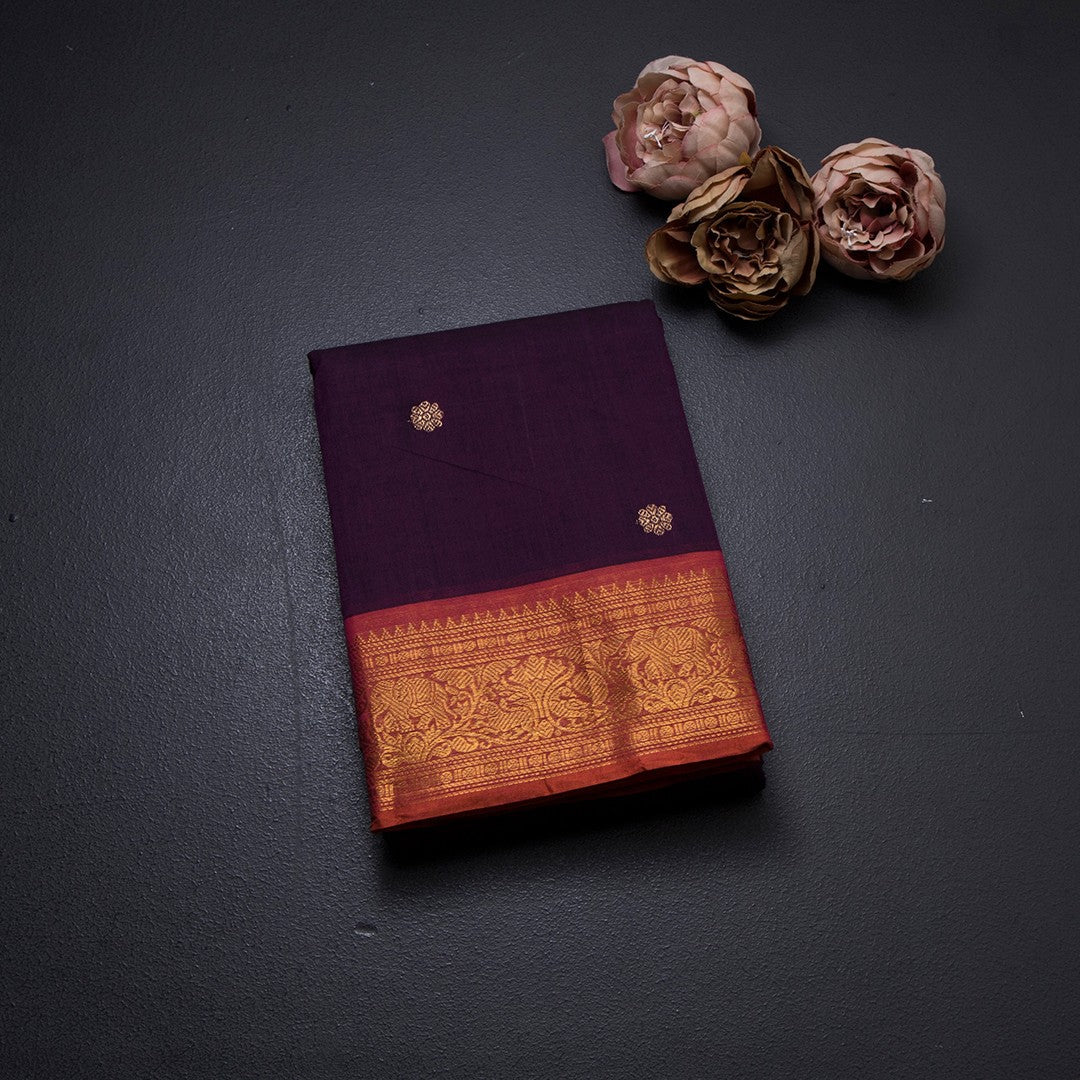 Kanchi Cotton Purple Saree With Small Zari Buttas On The Body, The stylish & ethnic range of cotton saree is quite comfortable to wear and easy to drape as well.