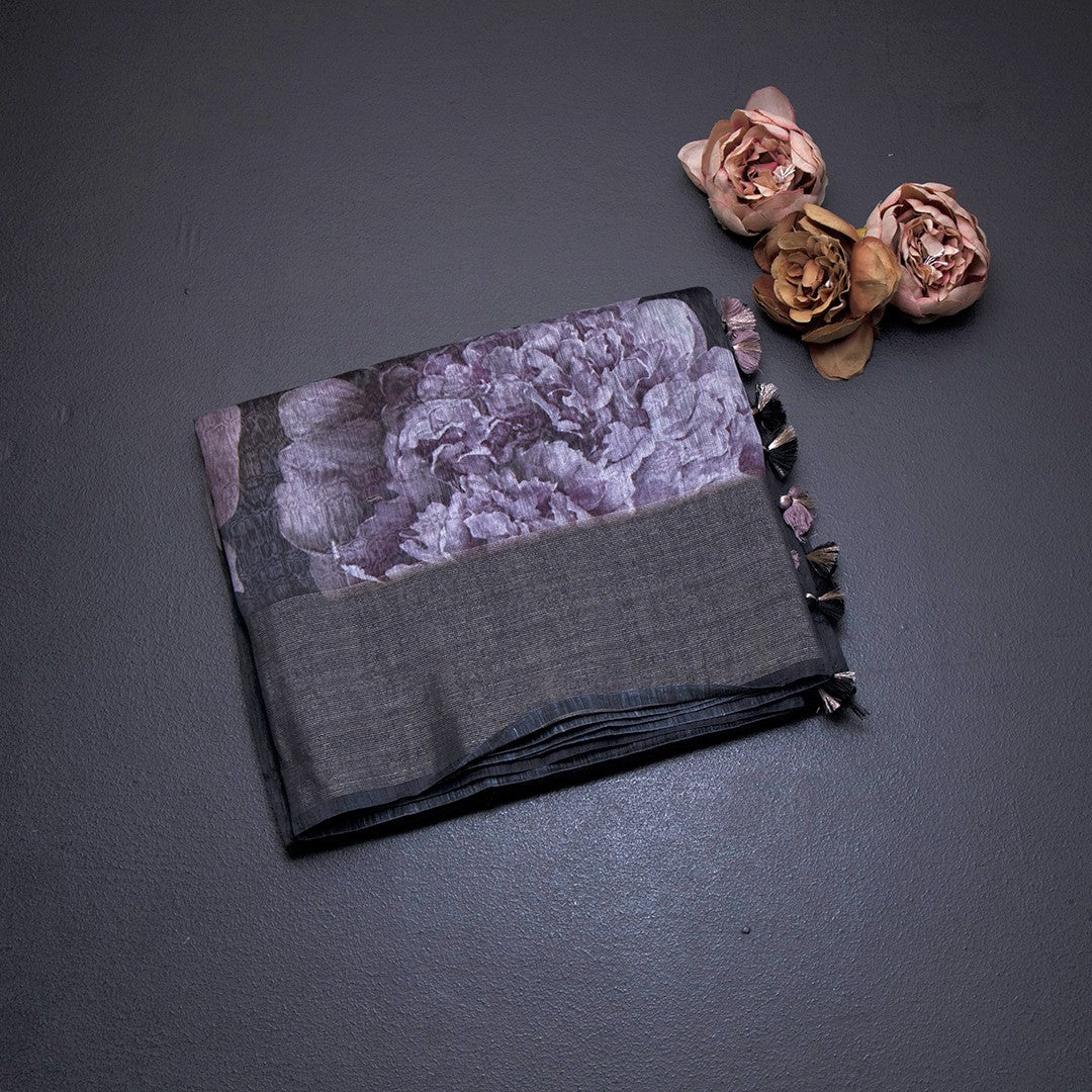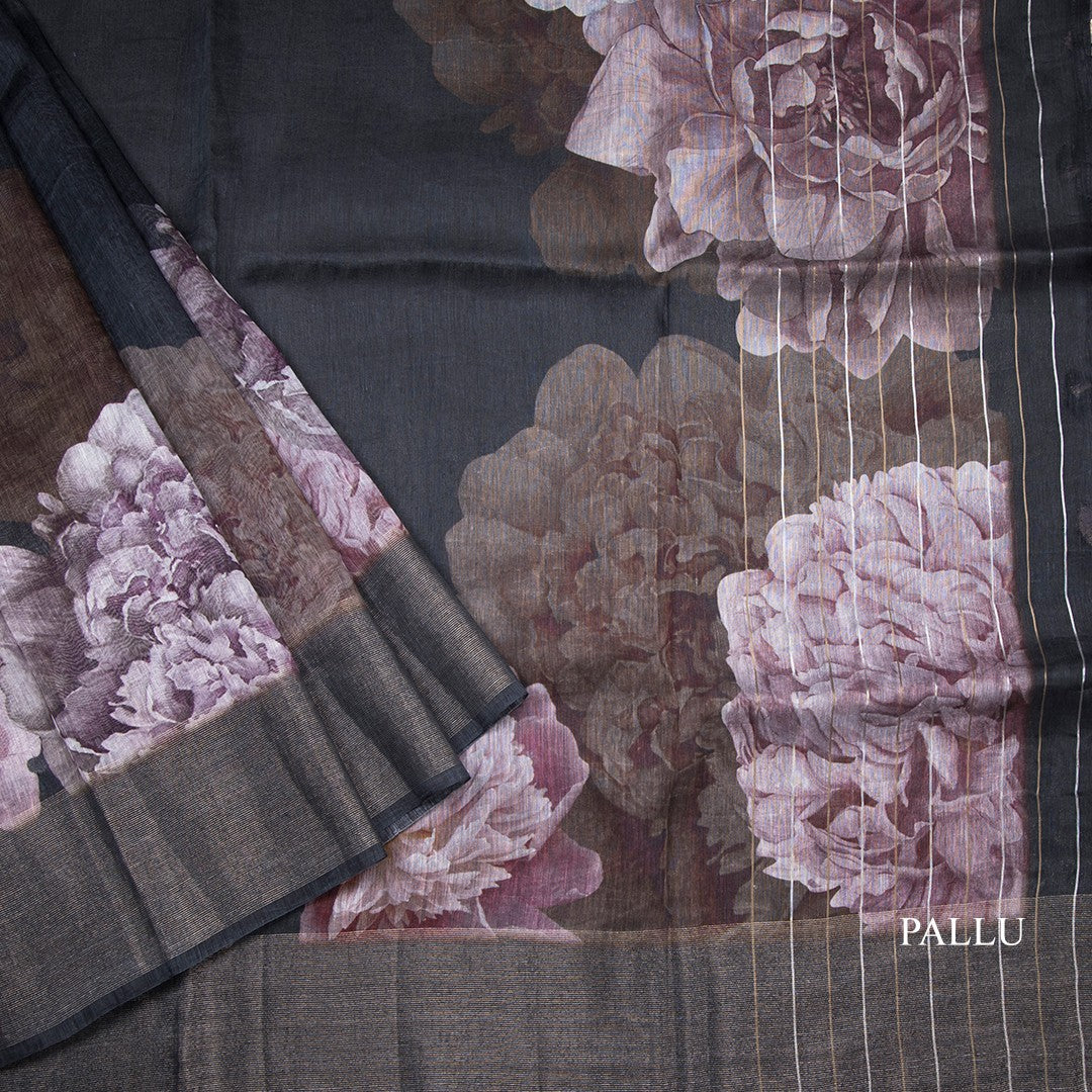 Linen Black Floral Printed Saree With Zari Border