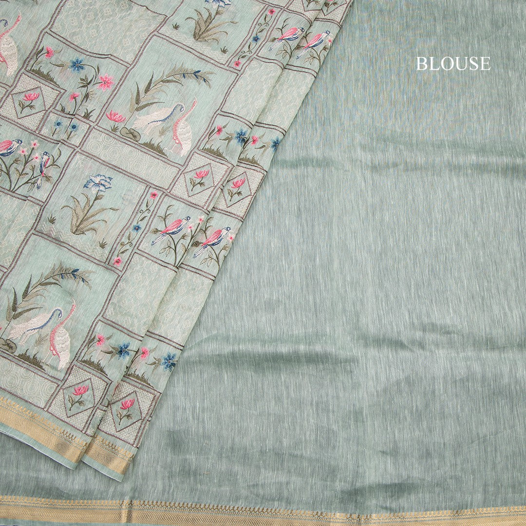 Linen Light Green Thread Embroidered Saree With Zari Border