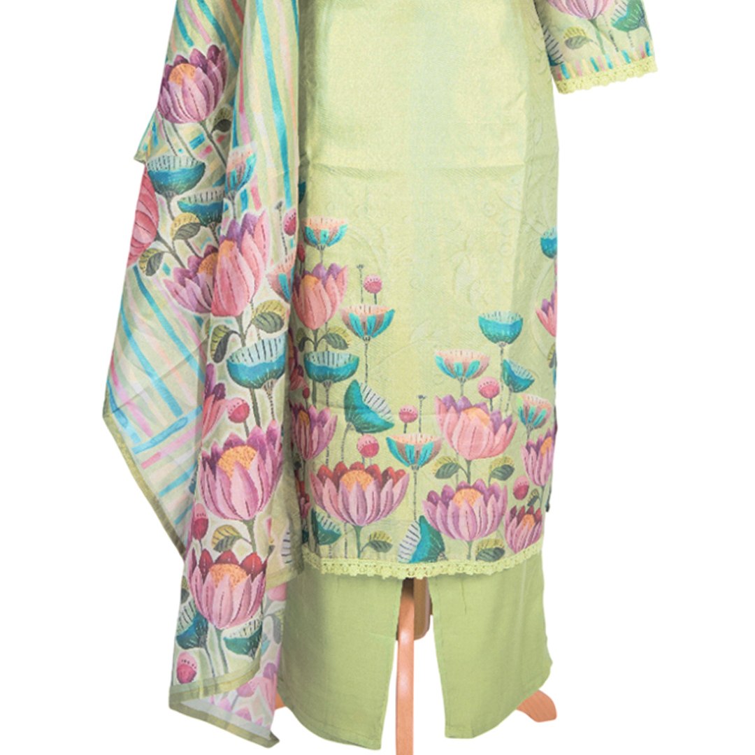 Pista Green Printed Readymade Salwar Suit, Straight Cut Top and Straight Pant With Dupatta