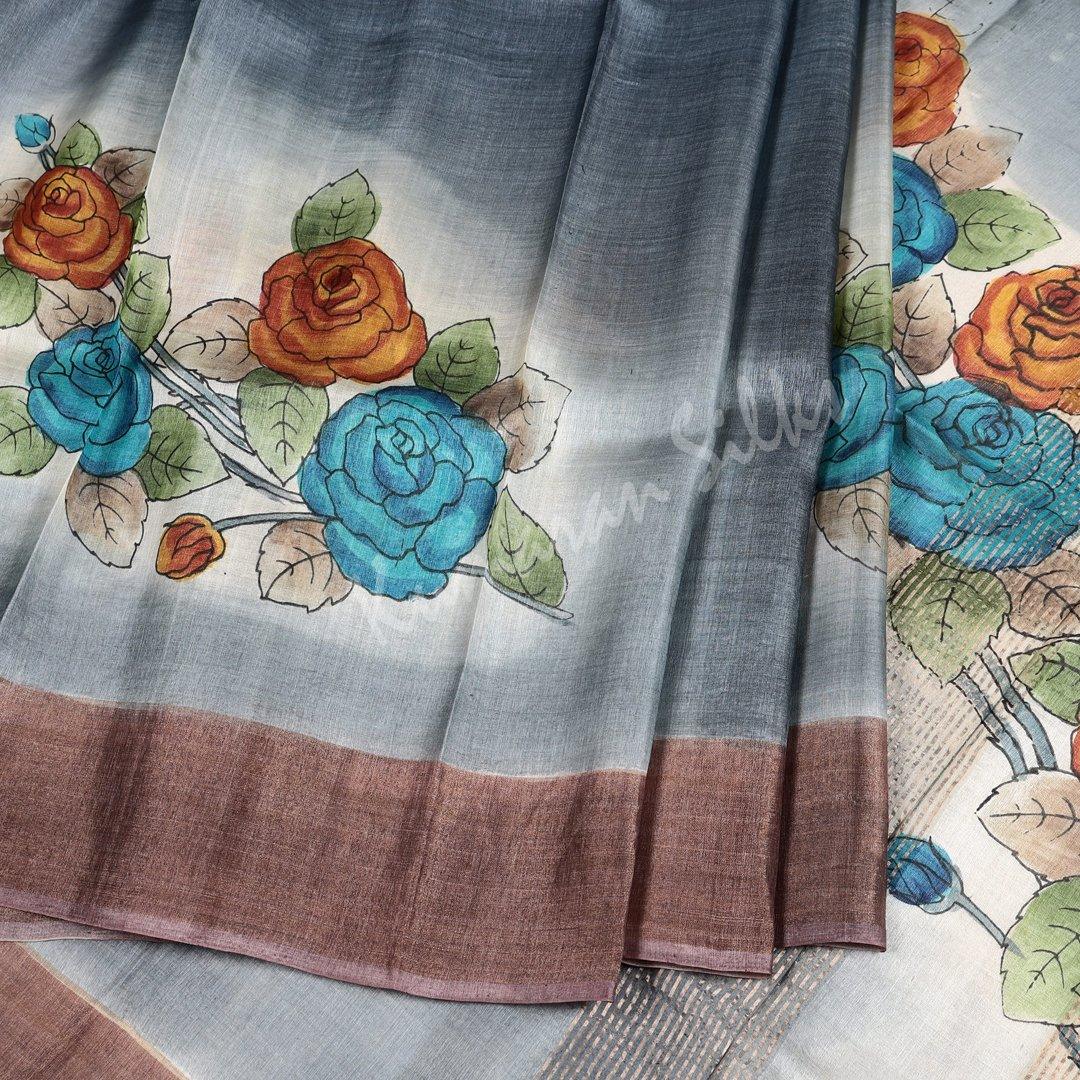 Pure Tussar Grey Floral Printed Saree, PURE TUSSAR HAS RICH COARSE TEXTURE. IT IS VERY COMFORTABLE TO WEAR EVEN IN SUMMER AS IT IS MORE POROUS AND BREATHABLE