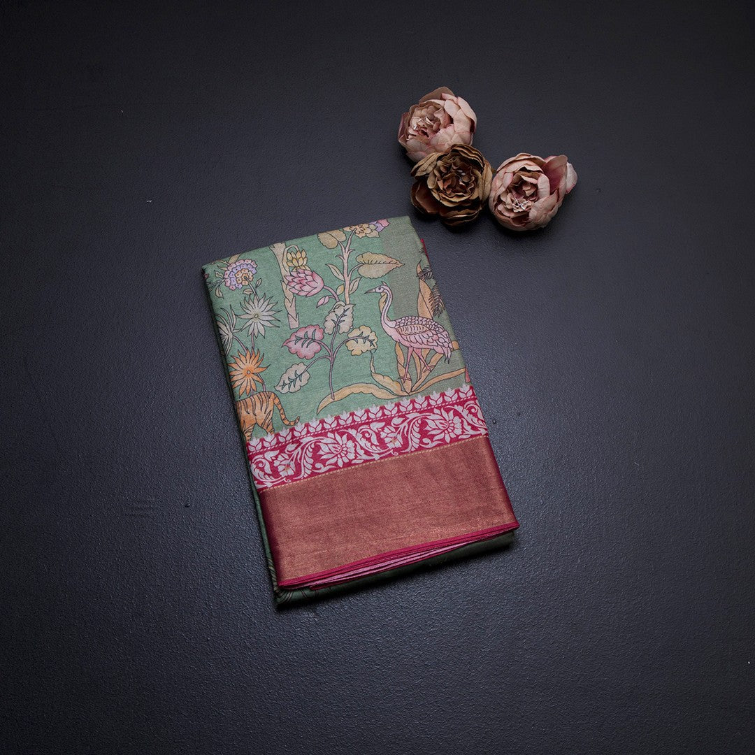 Pure Tussar Light Green Printed Saree With Forest Design