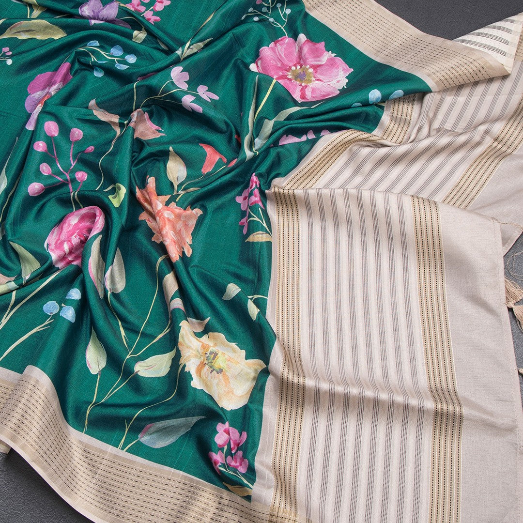 Raw Silk Dark Green Floral Printed Saree With Thread Border