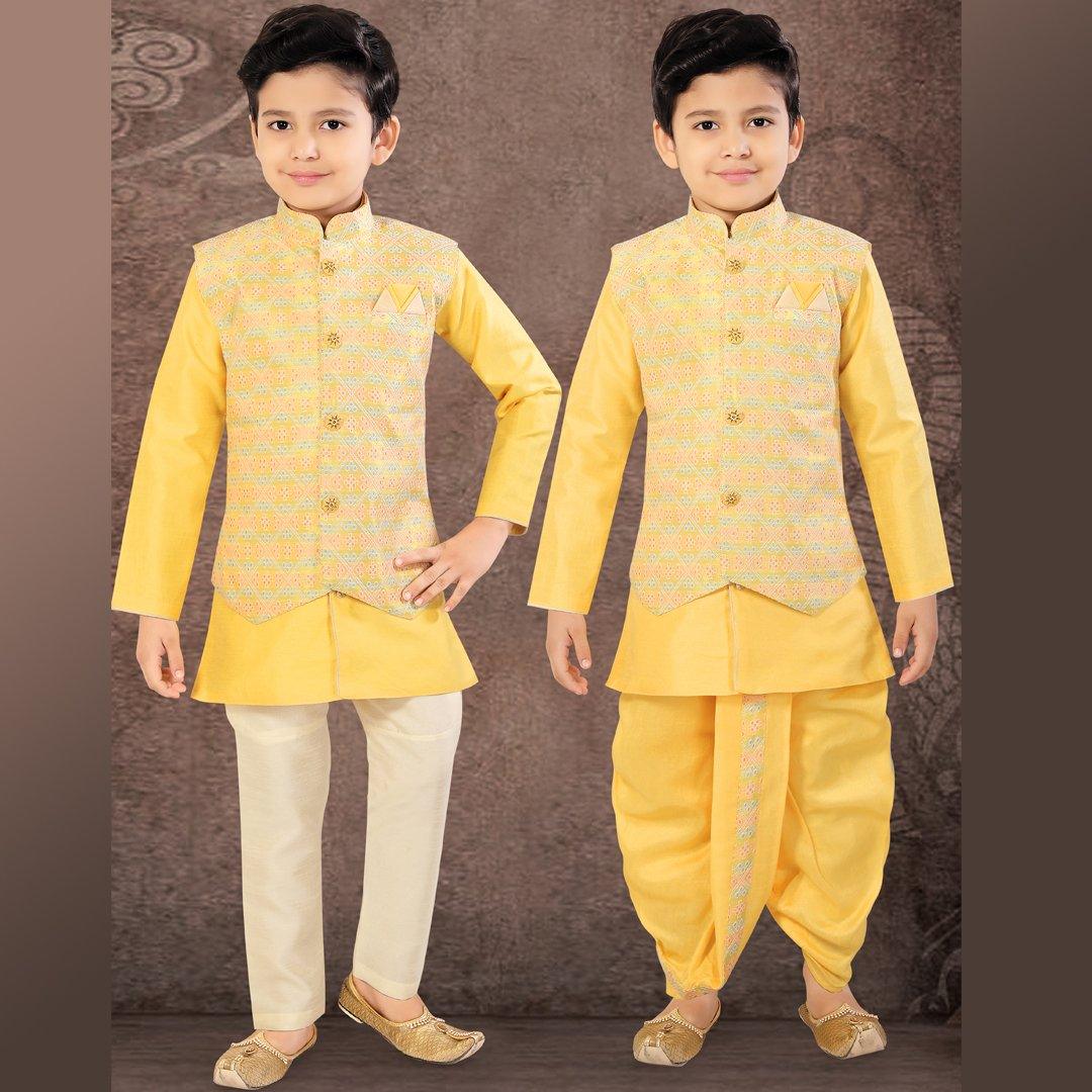 Raw Silk Yellow Sherwani Set, A Kids sherwani, for instance, is made using lighter fabrics to keep it comfortable. It is further adorned with light embroidery work and with interesting colors.