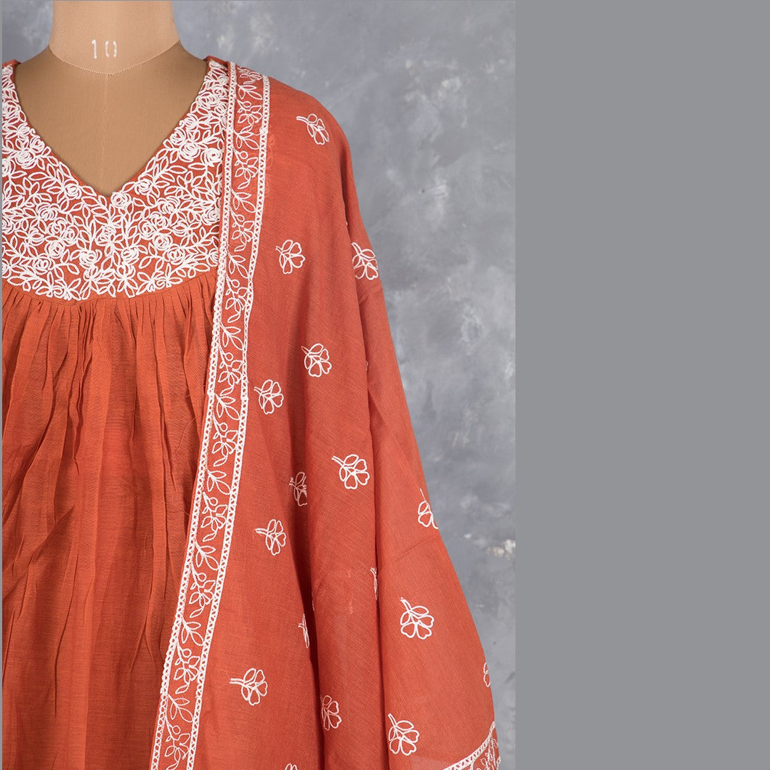 Rust Orange Cotton Thread Readymade Salwar Suit, Umbrella Top and Straight Pant With Dupatta