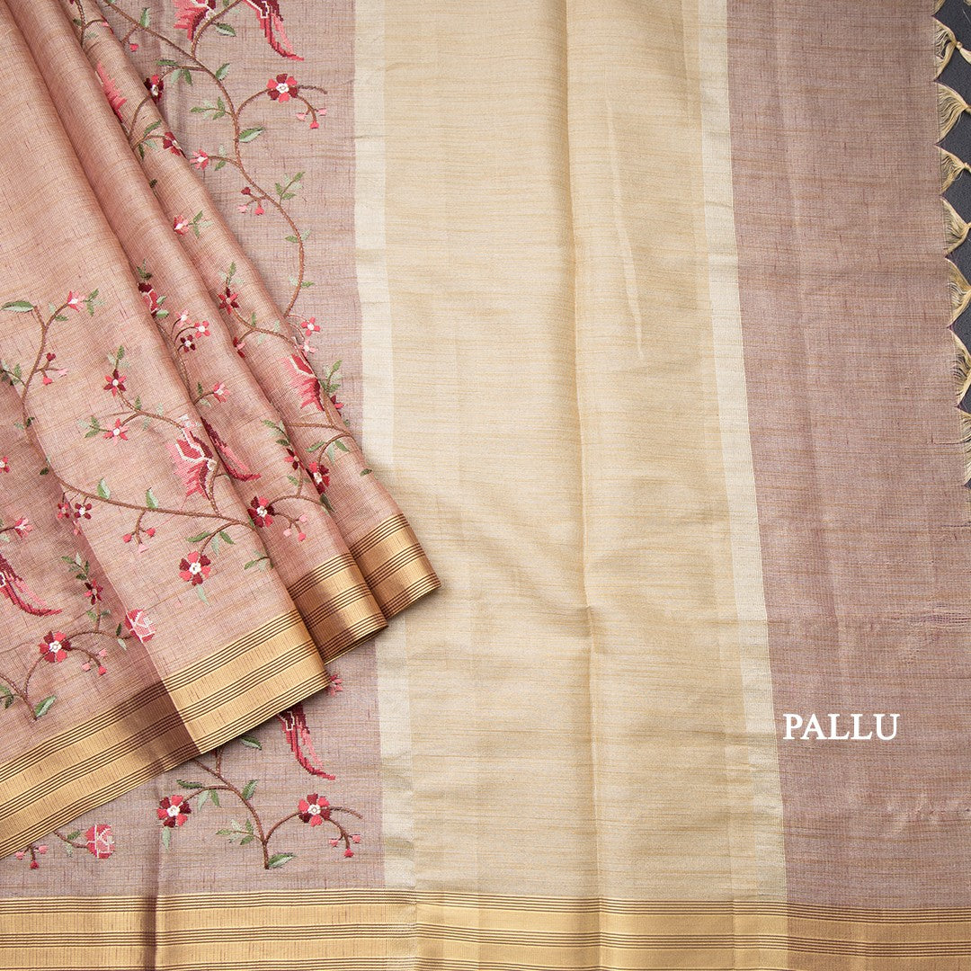 Semi Linen Light Brown Floral Thread Work Saree