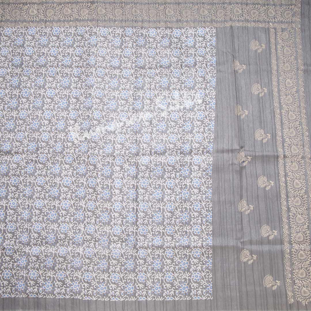 Semi Raw Silk Grey Floral Printed Saree