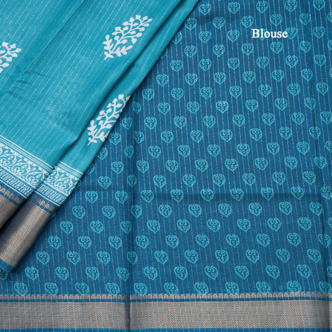 Semi Raw Silk Light Peacock Blue Printed With Zari Stripes Saree