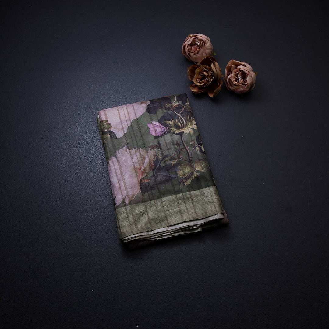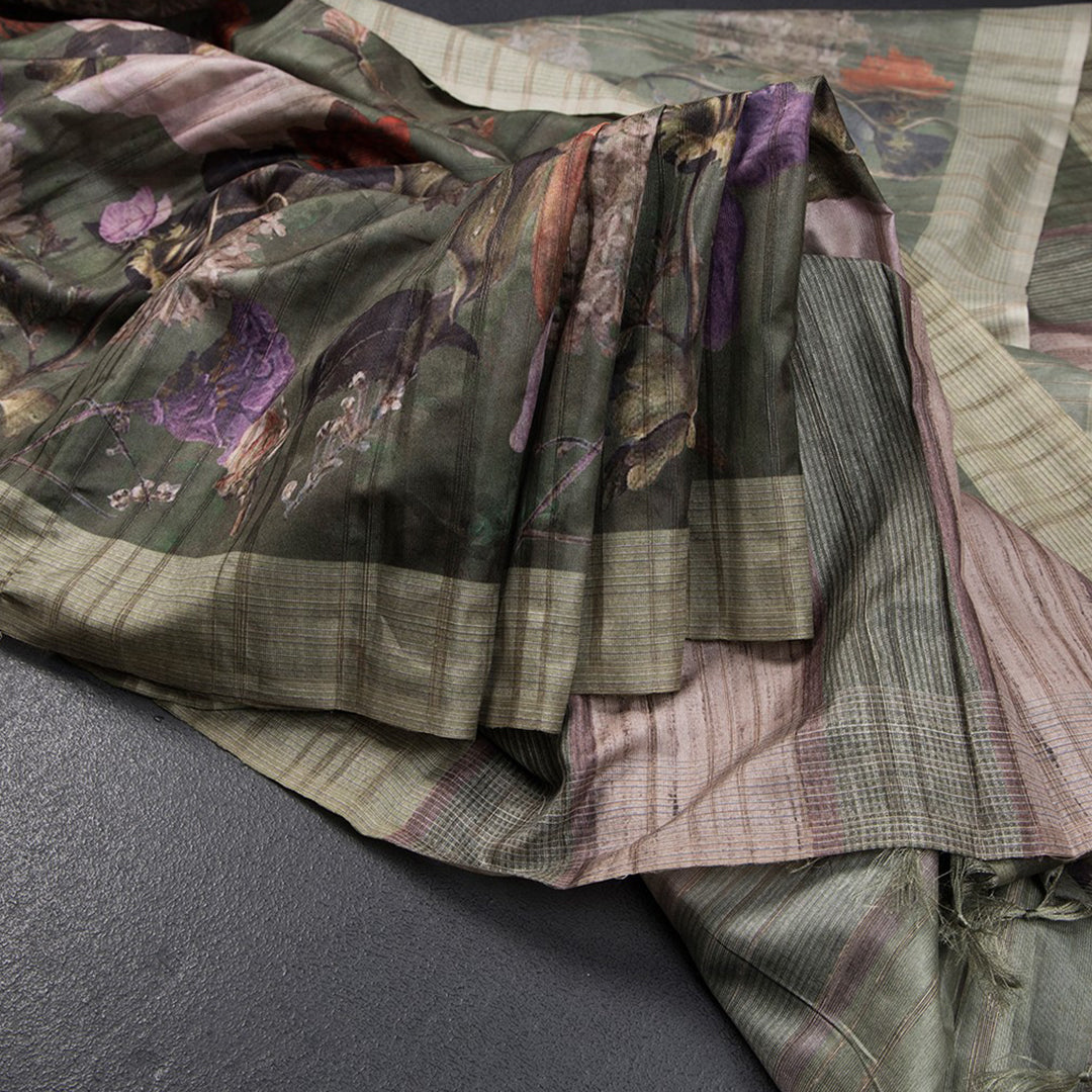 Semi Raw Silk Olive Green Floral Printed Saree, Experience the ecstasy of colour in these shiny lustrous semi raw silk sarees with elegant pallu and border.