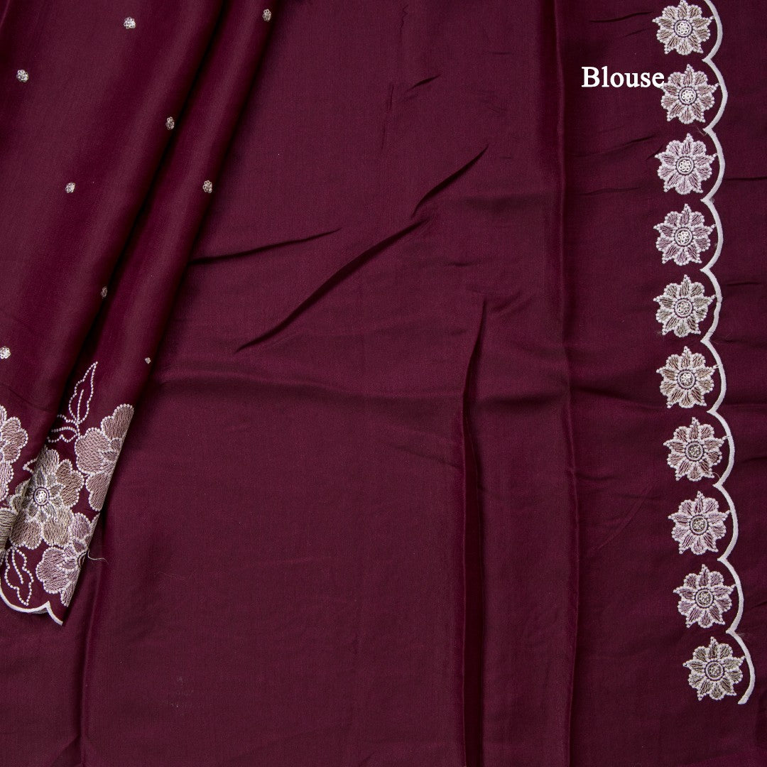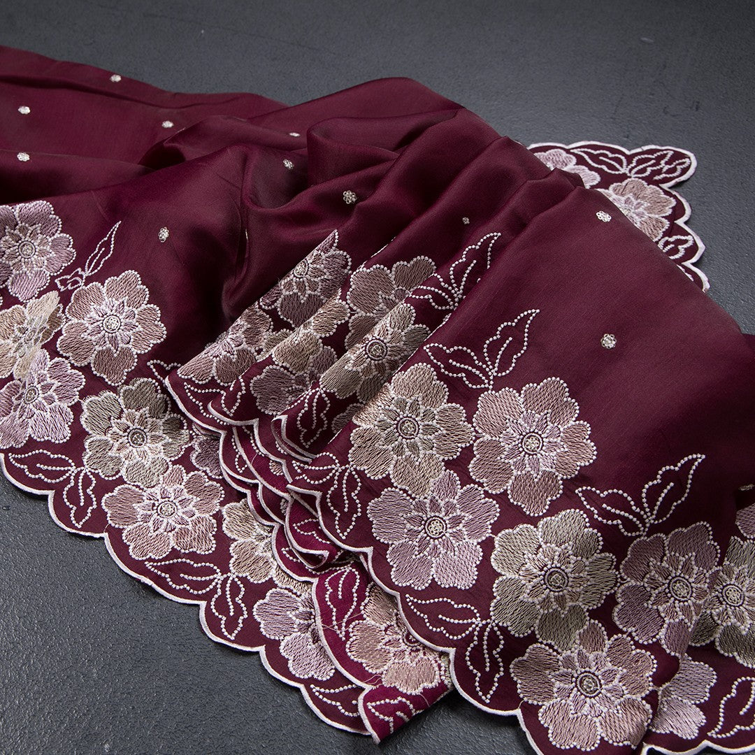 Semi Raw Silk Wine Colour Embroidered Saree With Floral Border Design