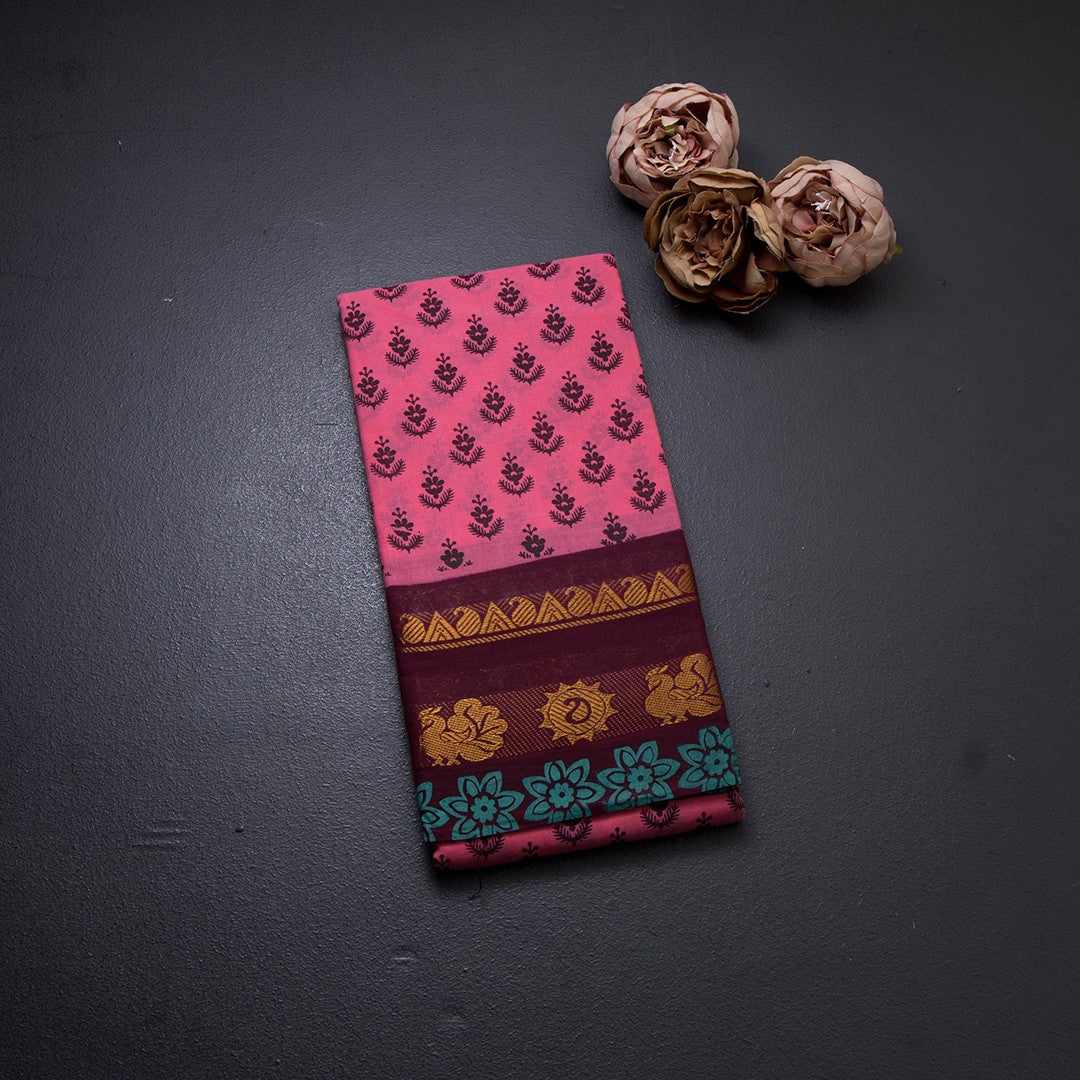 Sungudi Cotton Rose Pink Printed Saree Without Blouse 05