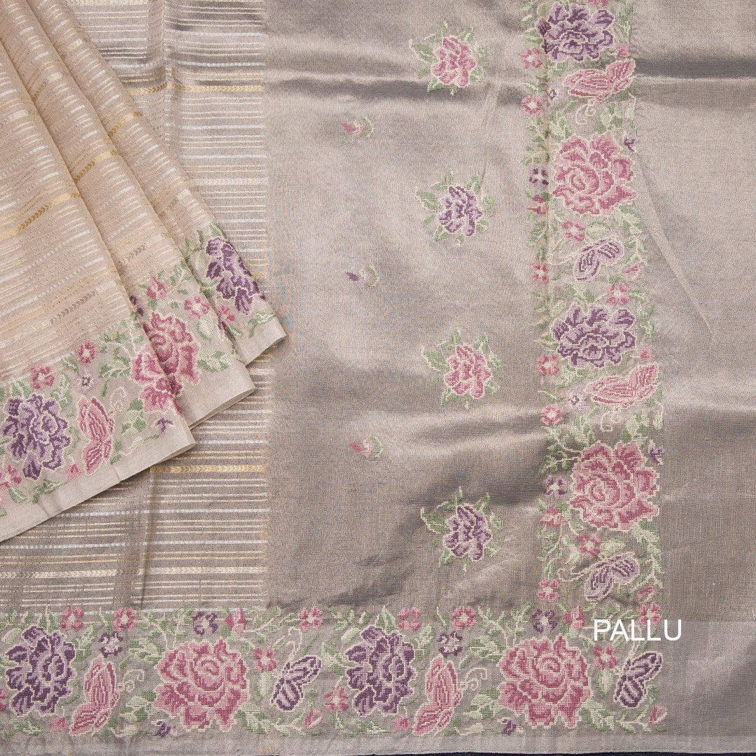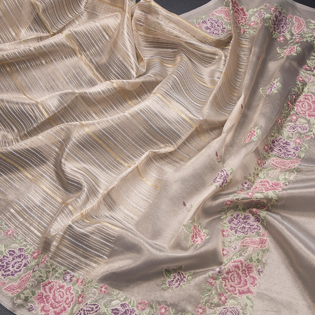 Tissue Banarasi Cream Stripes Saree With Thread Work Border