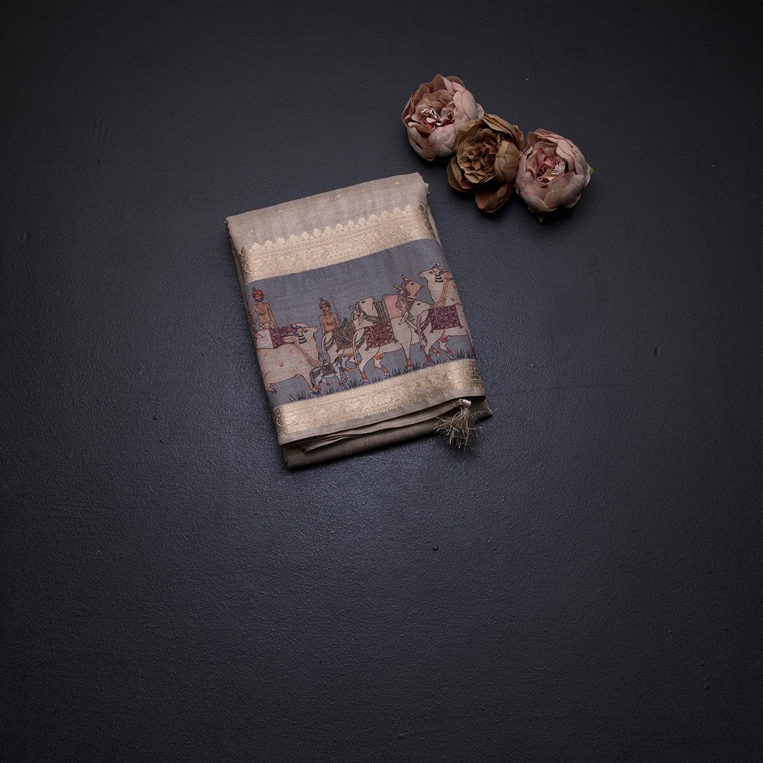 Tussar Cream Saree With Zari Buttas And Printed Border 02