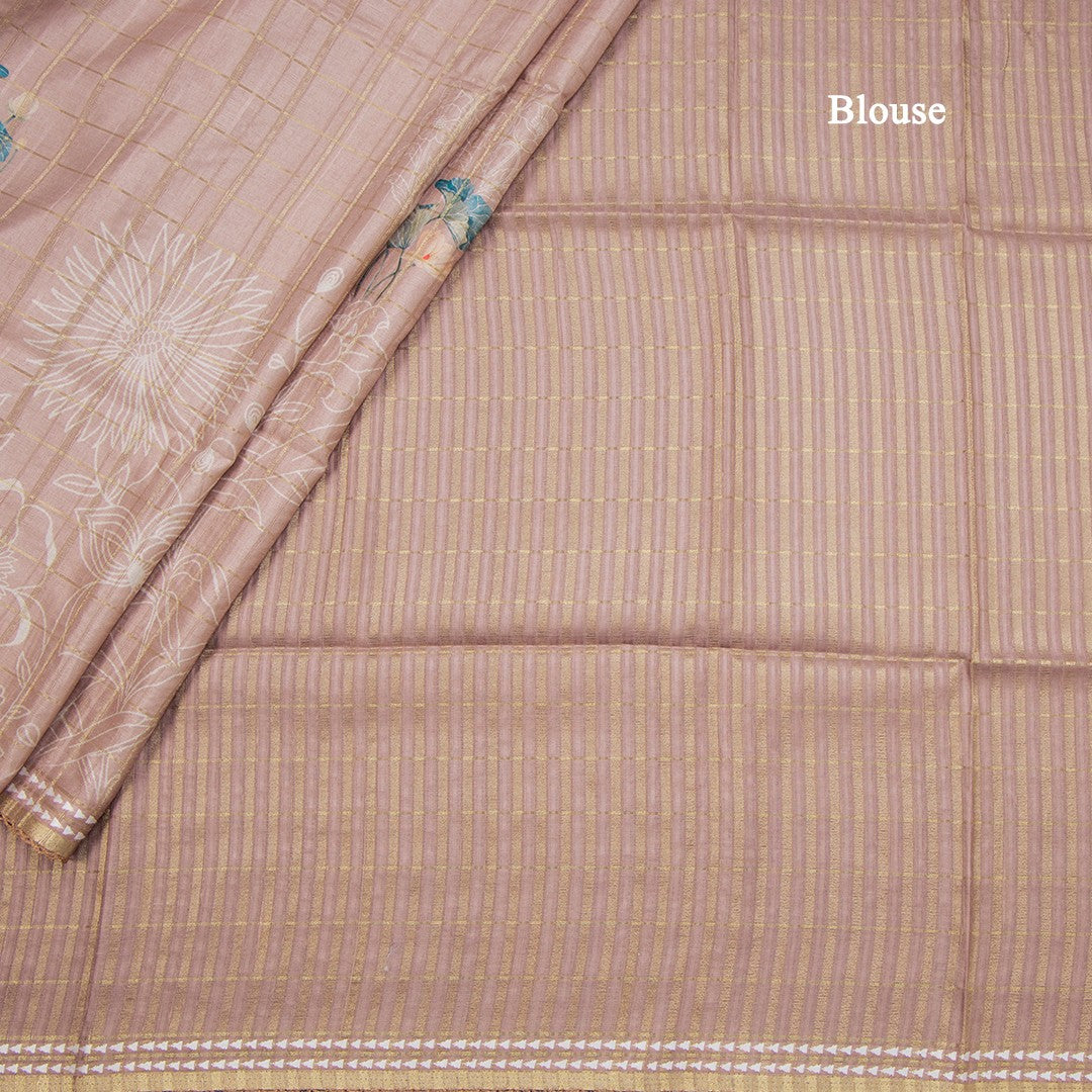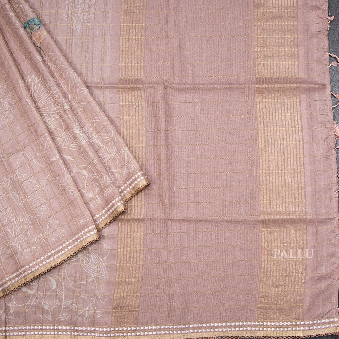 Tussar Light Brown Zari Checked Saree With Printed Work