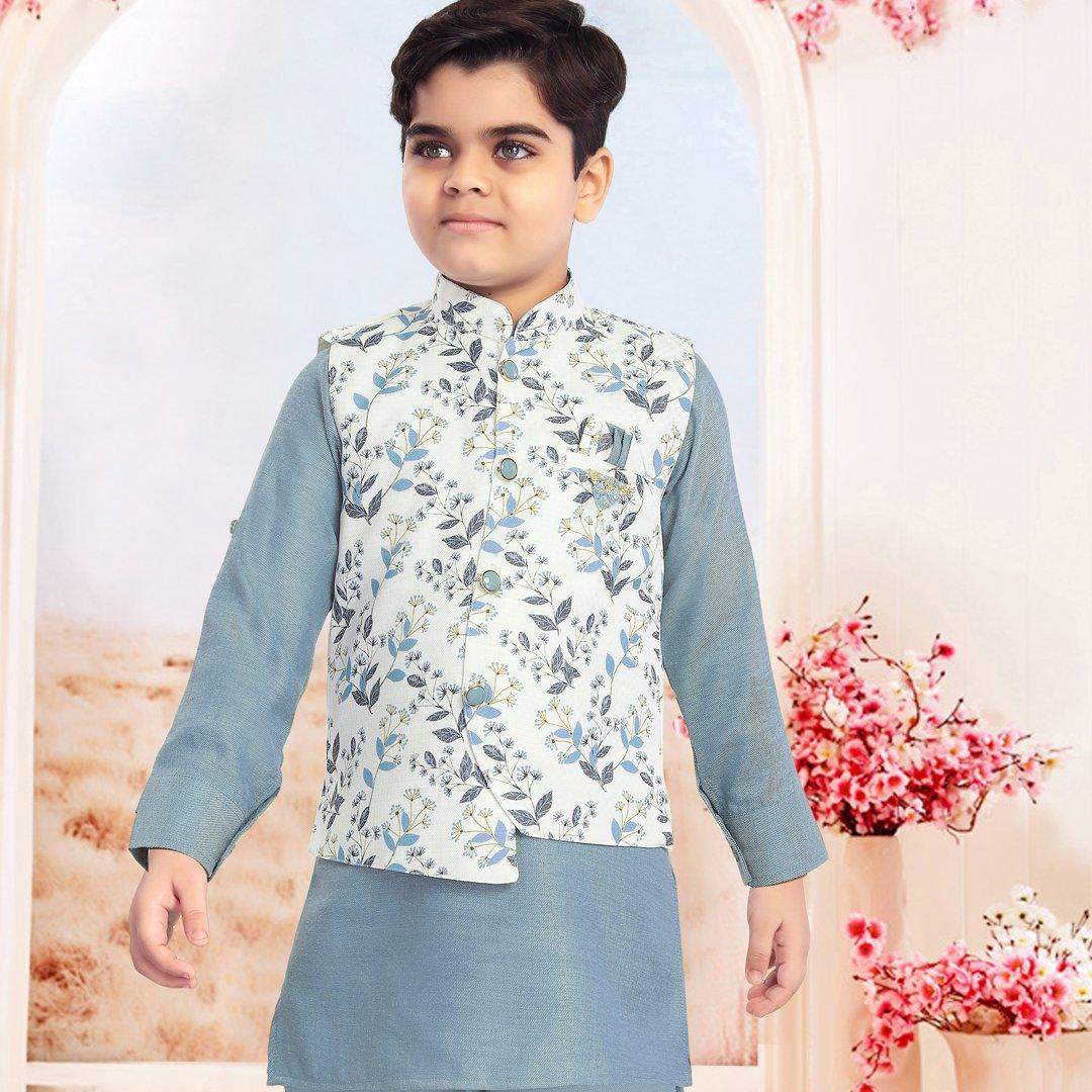 Raw Silk Greyish Blue Sherwani Set, A Kids sherwani, for instance, is made using lighter fabrics to keep it comfortable. It is further adorned with light embroidery work and with interesting colors.