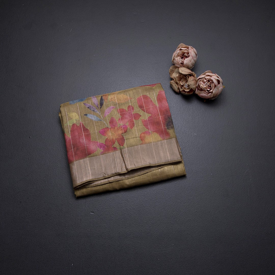 Raw Silk Light Mehandi Green Thread Checks With Floral Printed Saree