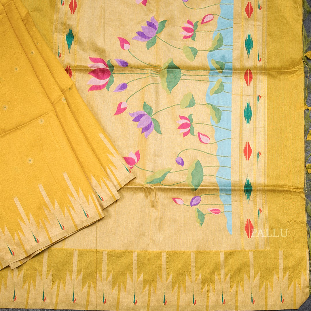 Raw Silk Mango Yellow Saree With Zari Buttas And Temple Border