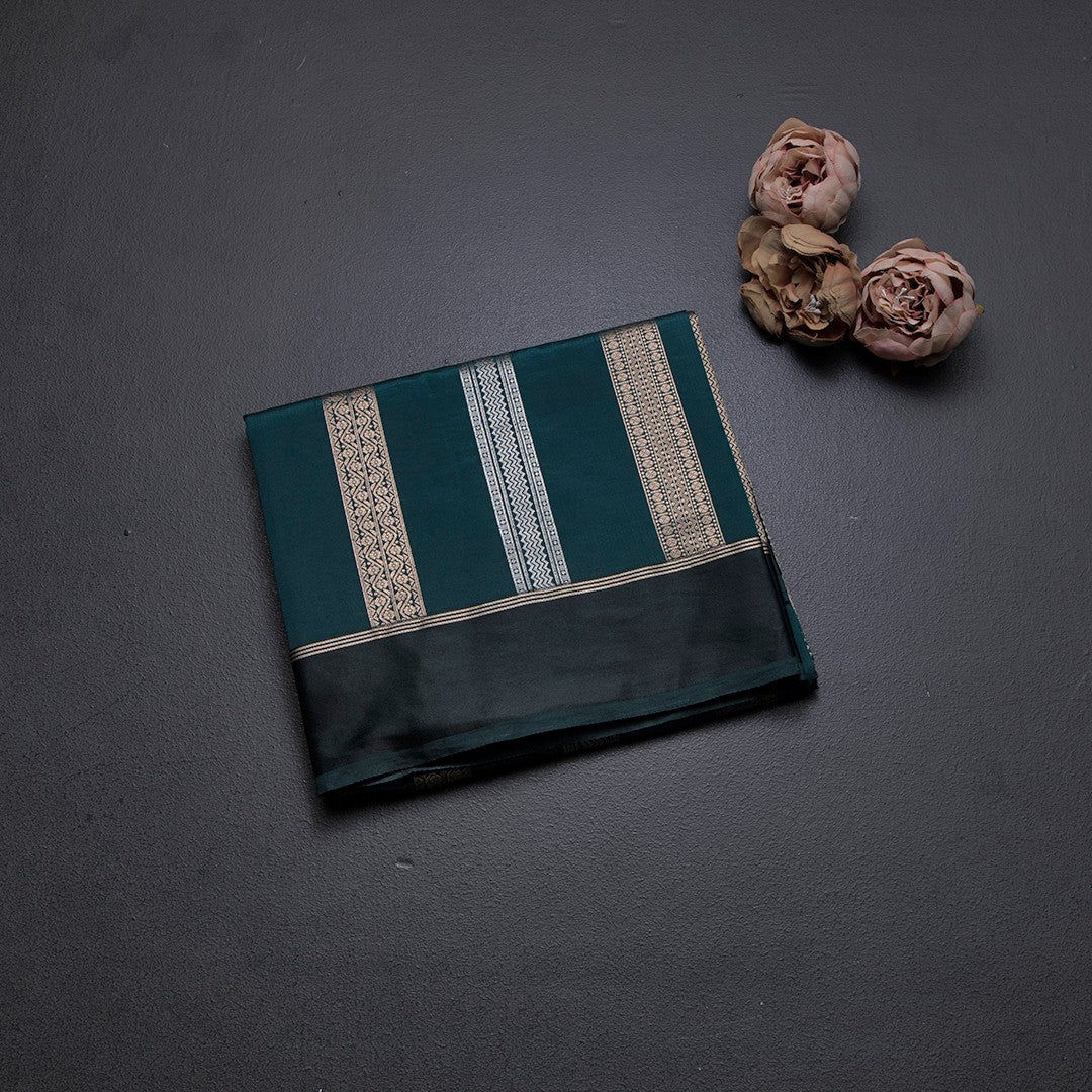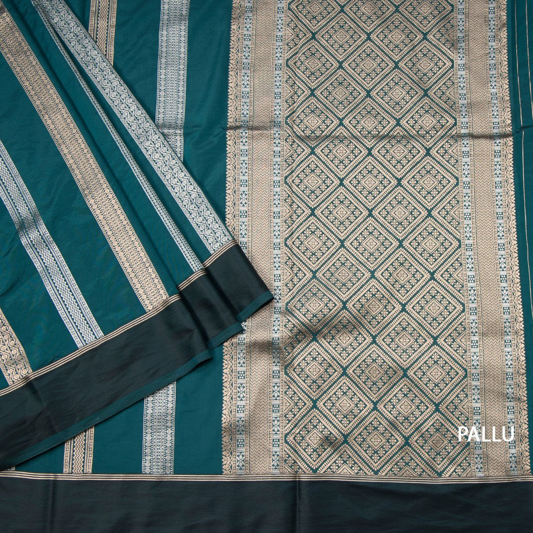 Raw Silk Teal Green Saree With Zari Stripes Design And Simple Border