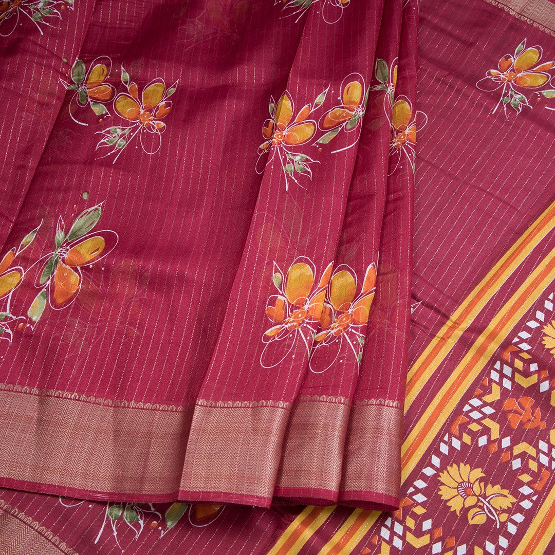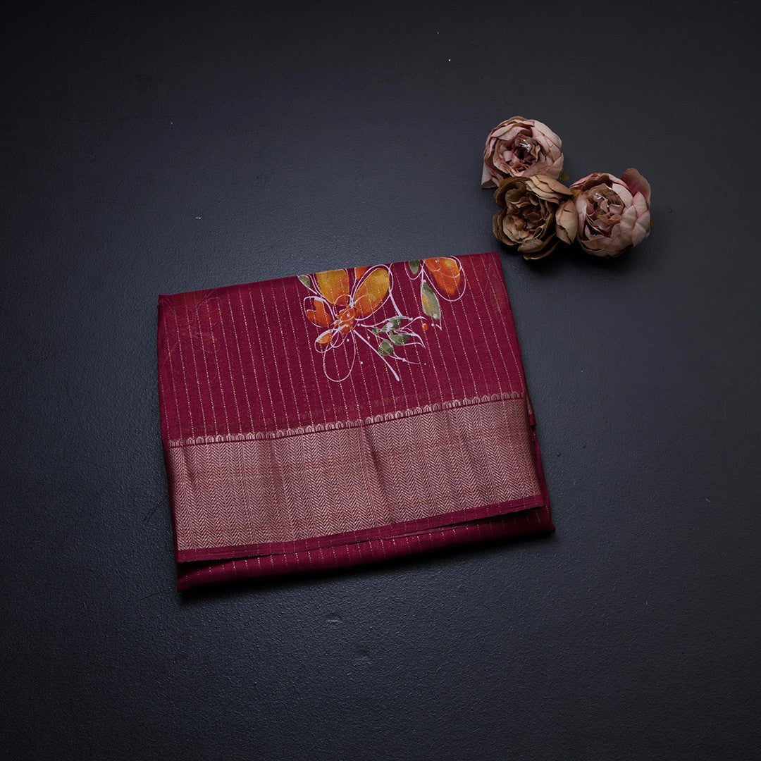 Semi Raw Silk Maroon Printed With Zari Stripes Saree