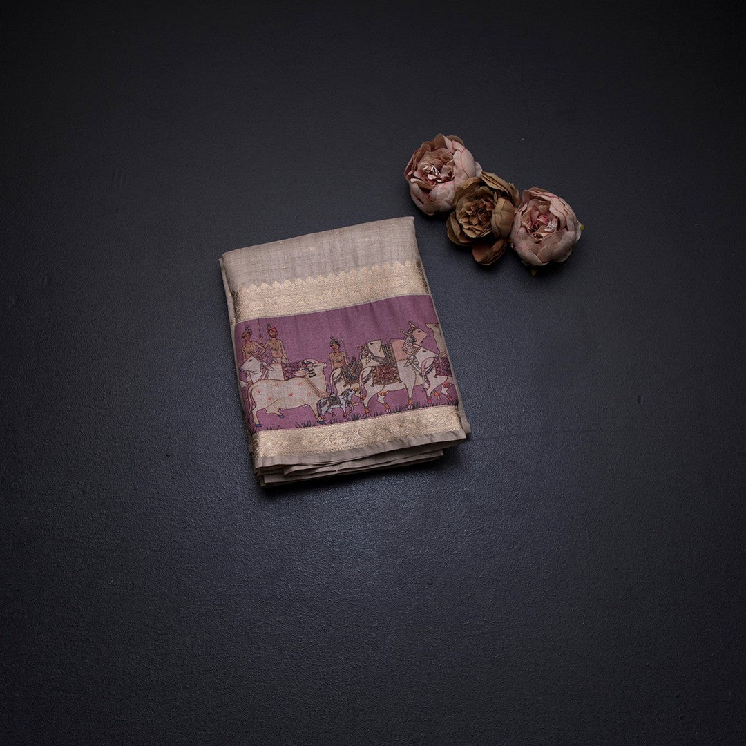 Tussar Cream Saree With Zari Buttas And Printed Border
