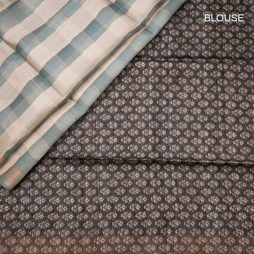 Tussar Dark Grey Checked Saree
